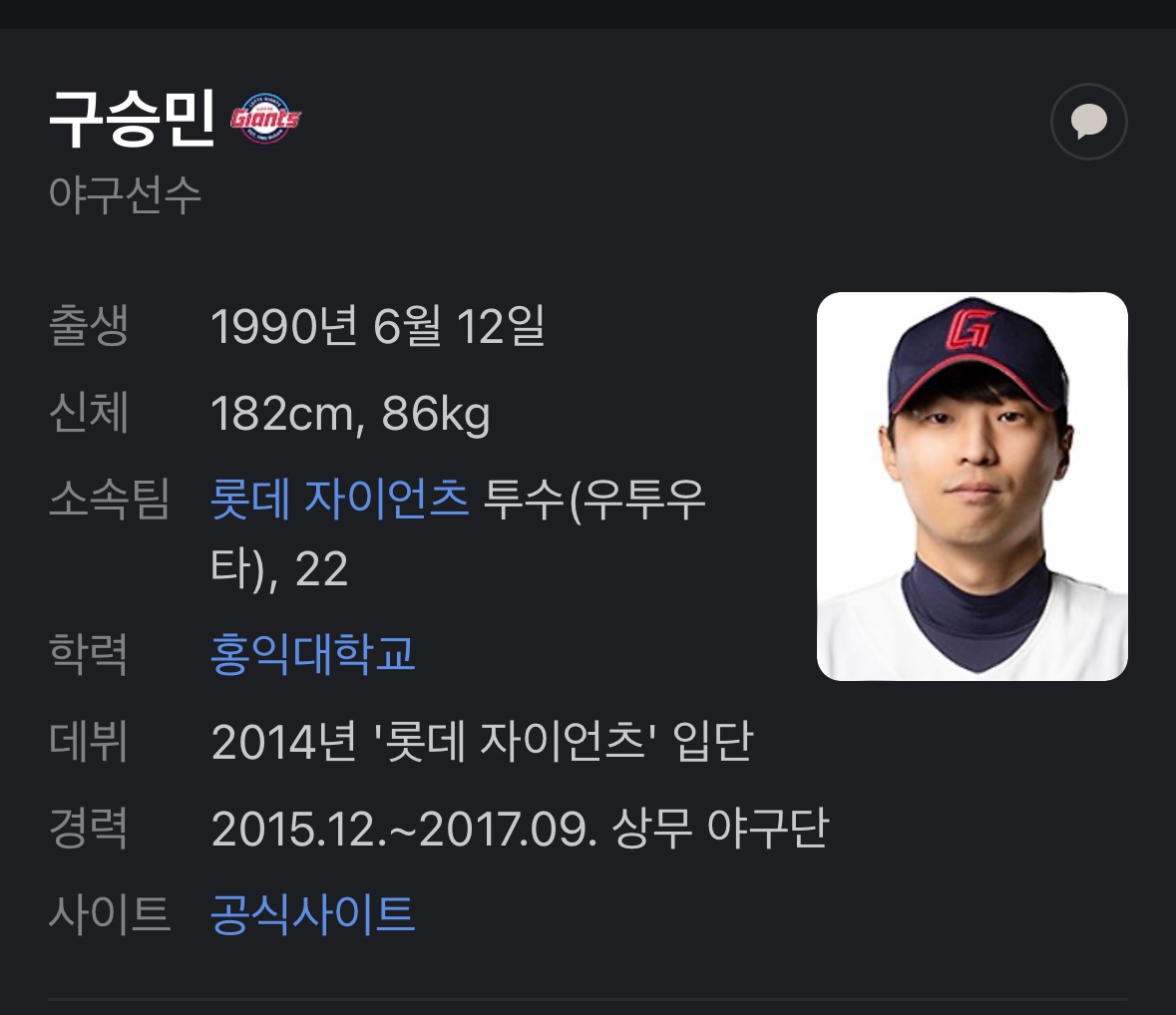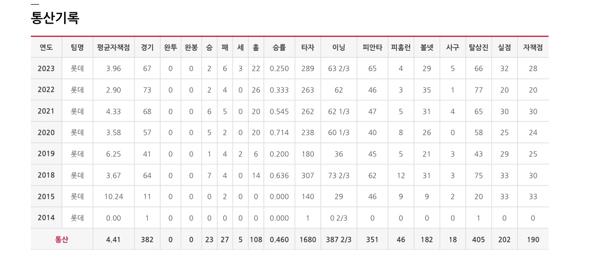 구승민 선수는 아홉 싲느 통산 4.41 평균자책점, 387경기 23승 27패 5세이브 108 홀드를 기록한 전형적인 중간계투입니다. 꾸준한 활약을 선보인 리그 중상위권의 필승조라고 할 수 있습니다.