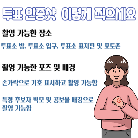 우선 확인하셔야할 것이 인증샷 촬영 장소입니다. 선거에 참여하신 분들은 투표소 및 기표소 안에서 절대 인증샷을 촬영하시면 안 됩니다. 대신 투표소 밖이나 투표소 입구에 설치된 표지판 및 별도로 마련된 포토존 등에슨 인증샷 촬영이 가능합니다.