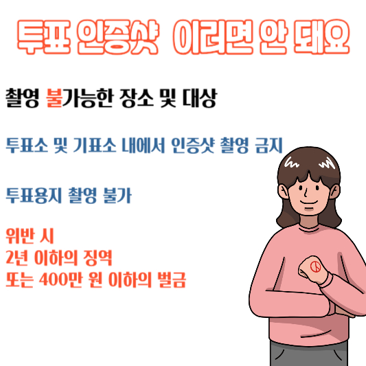 우선 확인하셔야할 것이 인증샷 촬영 장소입니다. 선거에 참여하신 분들은 투표소 및 기표소 안에서 절대 인증샷을 촬영하시면 안 됩니다. 대신 투표소 밖이나 투표소 입구에 설치된 표지판 및 별도로 마련된 포토존 등에슨 인증샷 촬영이 가능합니다.