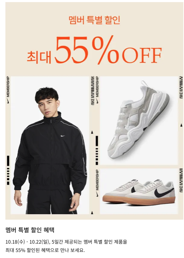나이키 멤버스 데이는 10월 16일에 시작해서 10월 22일까지 진행됩니다. 나이키 어플이나 온라인 스토어 혹은 나이키 직영 오프라인 매장에서 할인된 가격으로 제품을 구매하실 수 있습니다. 제품별 할인율은 다르지만 최대 55%까지 할인된 가격에 구매 가능하시다고 합니다.