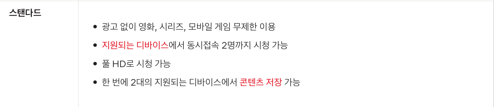 그 다음으로는 스탠다드 요금제와 프리미엄 요금제가 있습니다. 스탠다드 요금제는 월 13,500원으로 2명까지 동시접속 가능하며 풀HD 화질로 시청 가능합니다. 콘텐츠 저장도 두 대의 디바이스에서 가능합니다.
