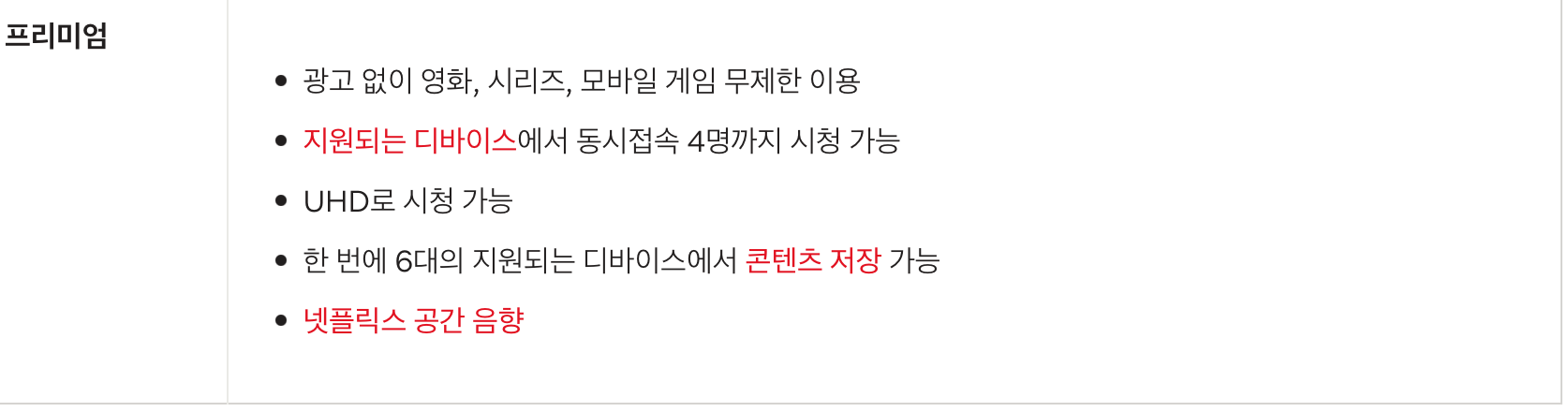 넷플릭스에서 가장 비싼 프리미엄 요금제는 프리미엄 요금제로 월 17,000원에 최대 4명까지 동시접속할 수 있습니다. 화질은 UHD로 시청 가능하며 콘텐츠 저장은 한꺼번에 여섯 대까지 가능합니다. 또 재생 장치에 따라 넷플릭스 공간 음향 효과도 누릴 수 있습니다.