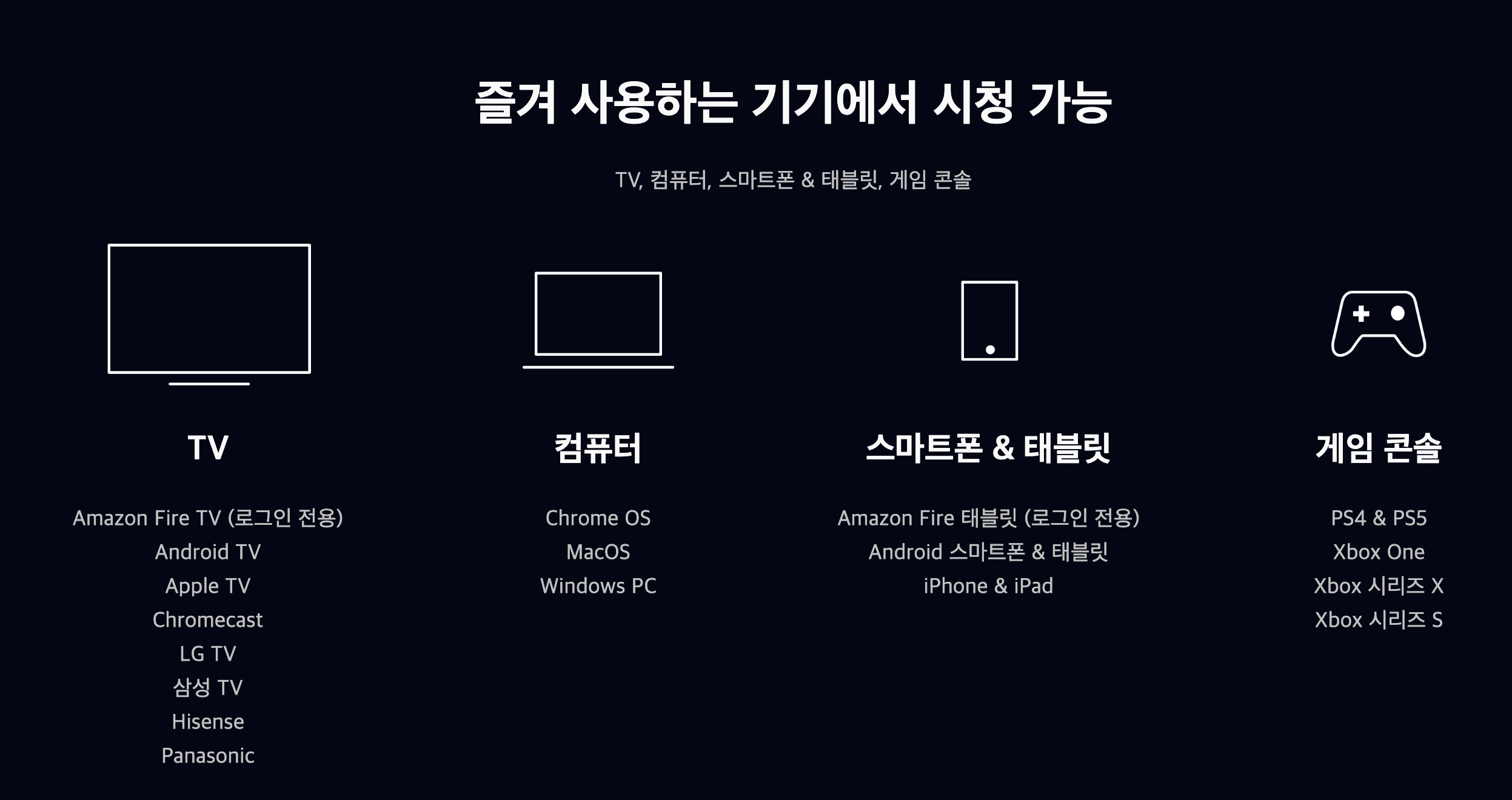 디즈니 플러스는 휴대폰 어플로도 볼 수 있고 지원하는 스마트 TV나 컴퓨터 태블릿, 게임 콘솔 등에서 하나의 요금제로 최대 10대까지 등록하여 시청할 수 있습니다. (단 동시 접속은 4명까지만 가능합니다.)