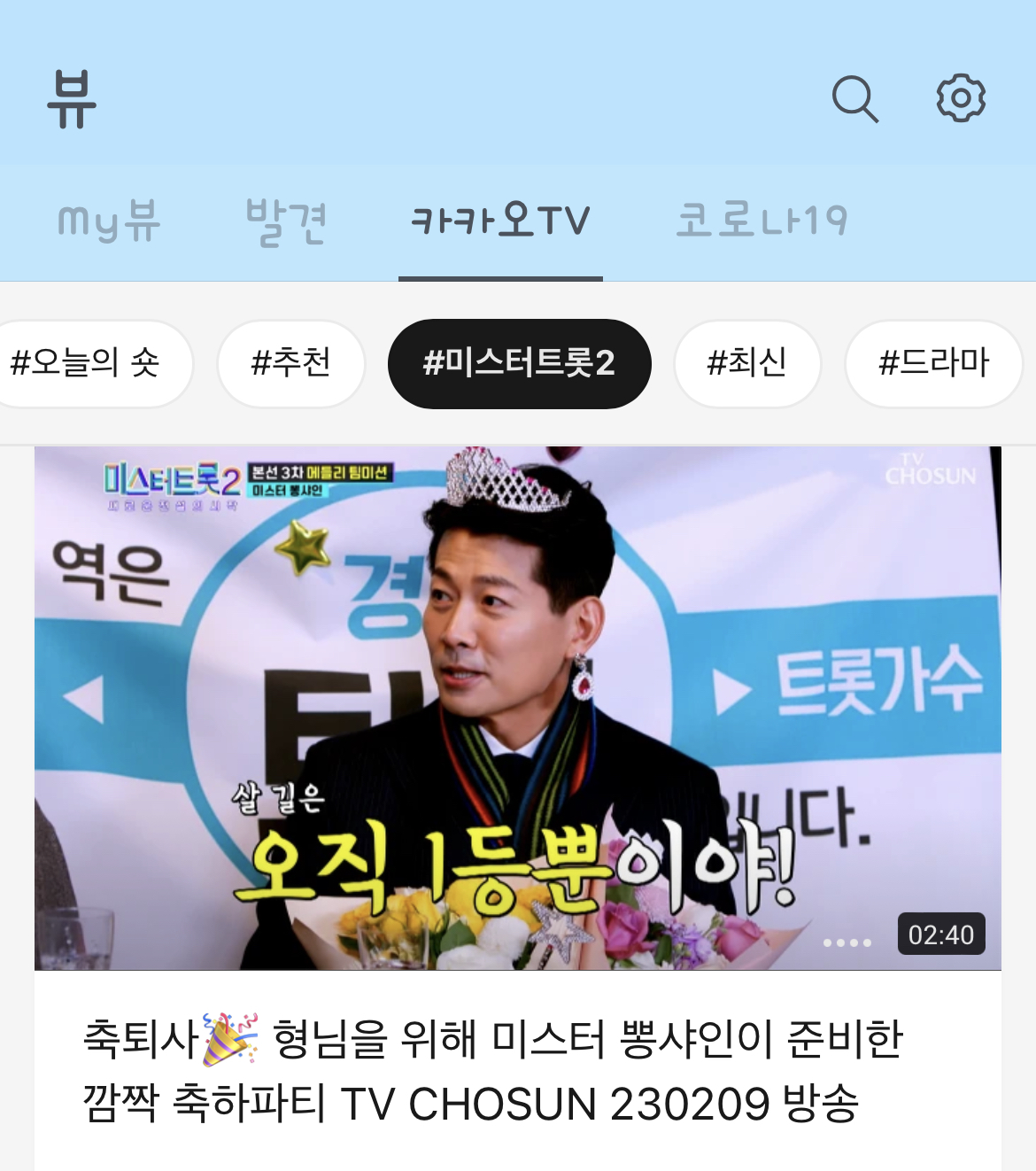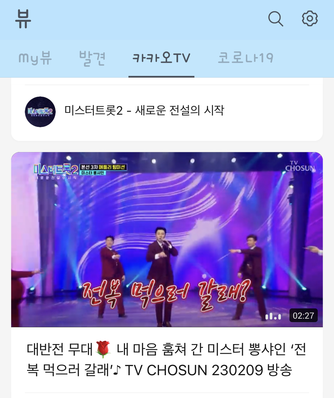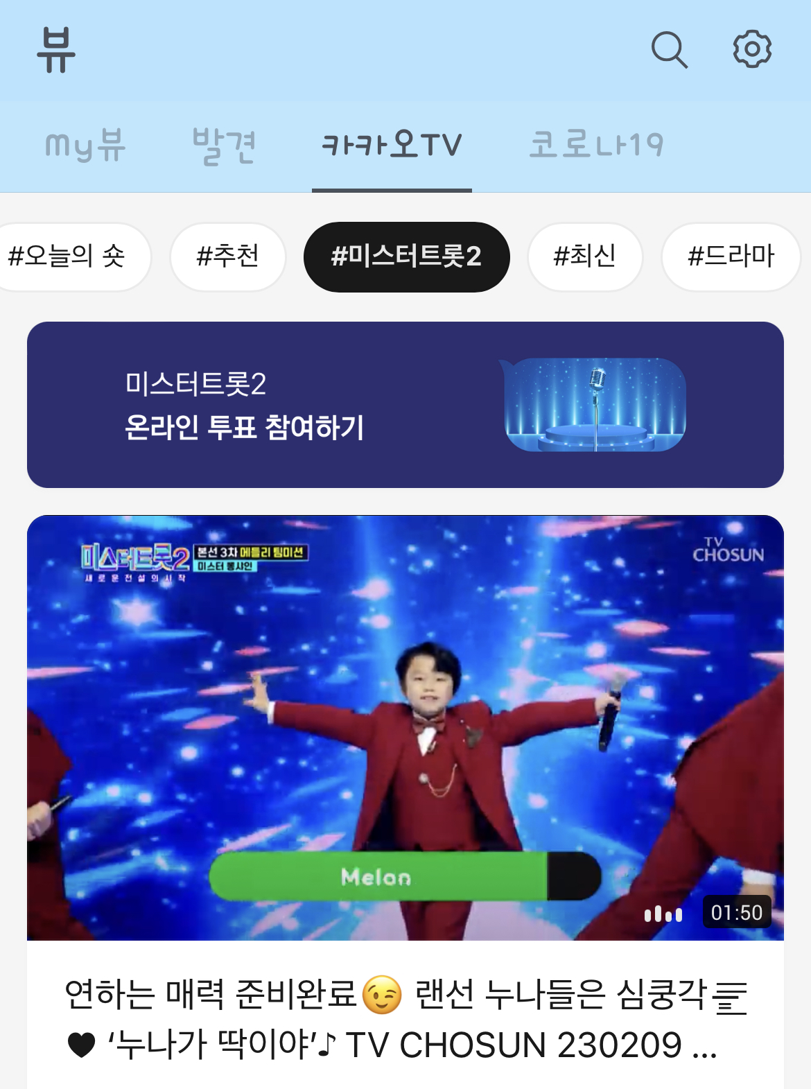 그럼 카카오TV 아래 '미스터 트롯2'가 보이고 그걸 누르면 아까 PC와 마찬가지로 온라인 투표 배너가 뜰겁니다. 그럼 그걸 누르면 아까와 같은 방식으로 투표하실 수 있습니다.