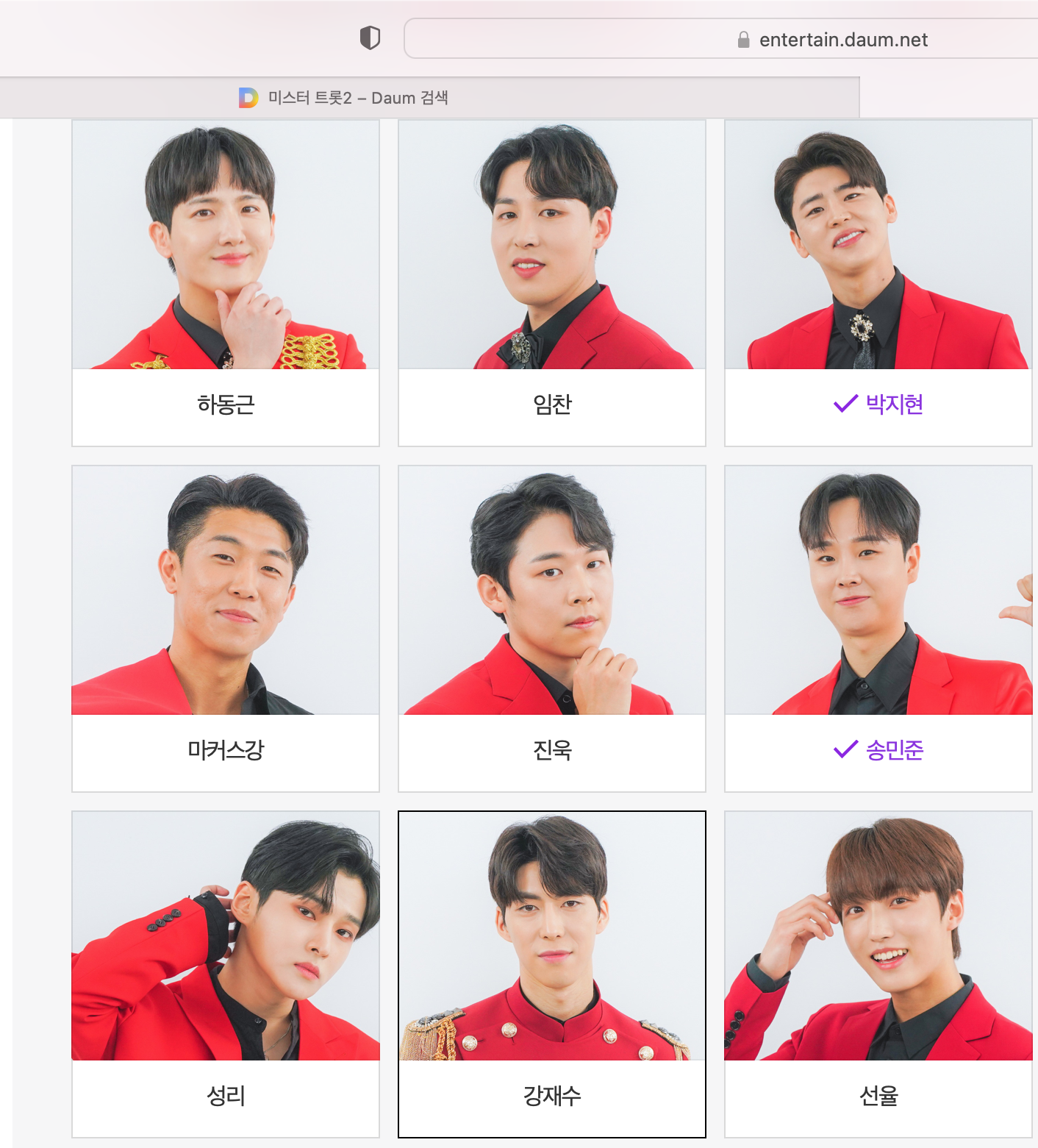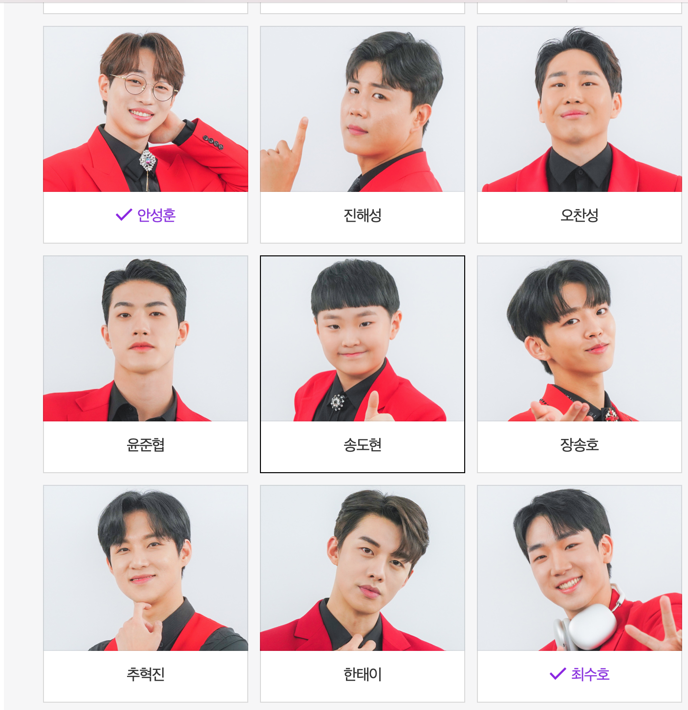 투표는 2월 10일부터 방송 전날인 2월 15일까지 하실 수 있습니다. 한 명이 하루 한 번, 일곱 명에게 투표할 수 있습니다. 위 화면에서 화면을 아래로 내려보시면 다음과 같이 투표 대상이 되는 참가자를 보실 수 있고 그 중에 응원하는 참가자 사진을 클릭하시면 됩니다.