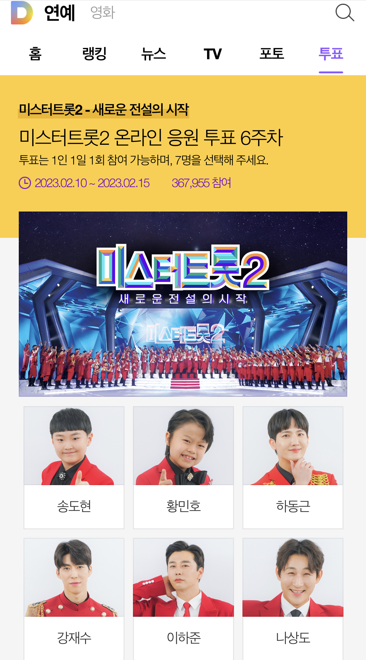 다시 온라인 투표가 시작되었습니다. 매일 1번 좋아하는 참가자 7명에게 소중한 한 표씩을 행사할 수 있습니다.