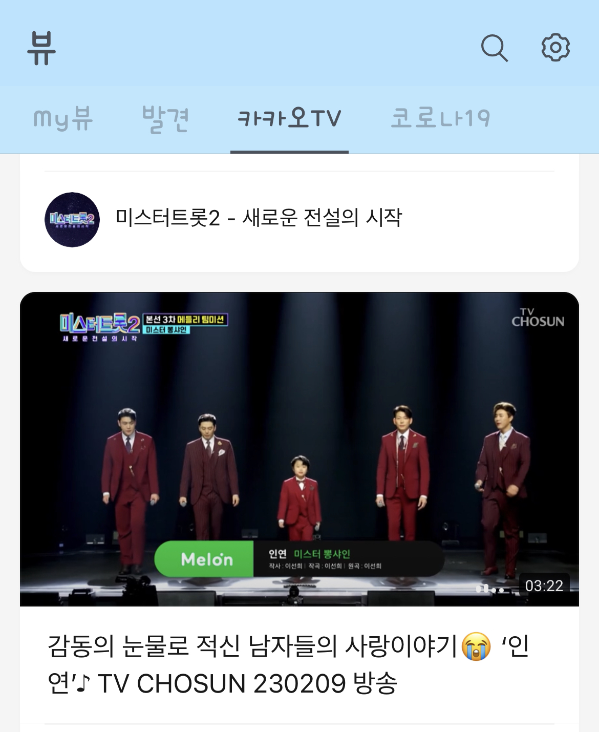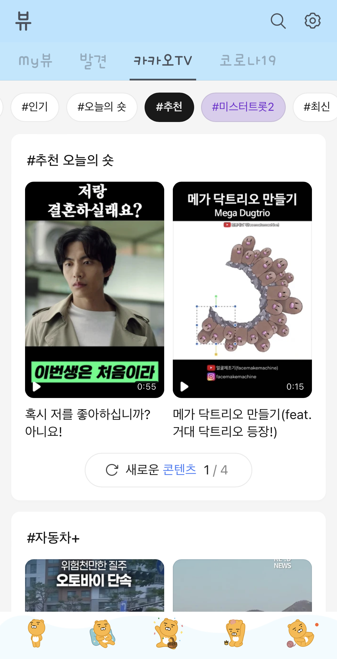 뷰에서 첫 줄 세 번째 있는 카카오TV를 터치하시면 다음과 같이 카카오TV 화면으로 이동합니다.