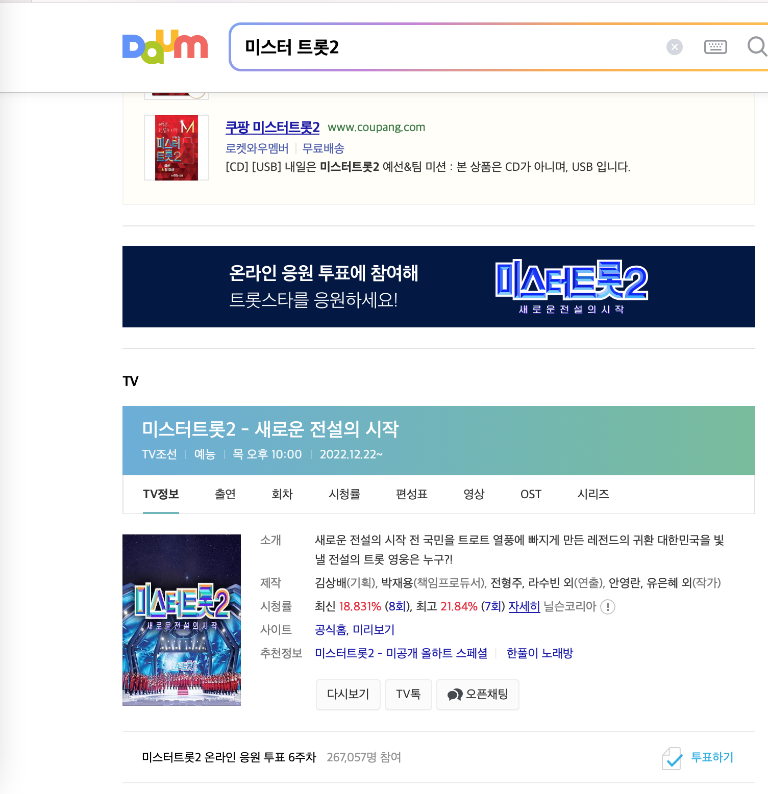 PC로 투표하시려면 우선 포털사이트 DAUM에서 아래와 같이 '미스터 트롯2'를 검색하시면 '온라인 응원 투표에 참여해 트롯스타를 응원하세요'라는 배너가 보일 겁니다.