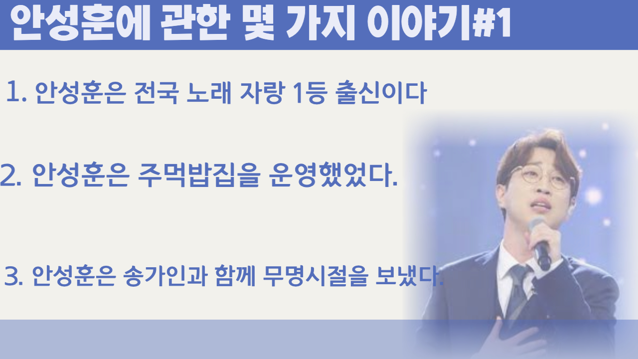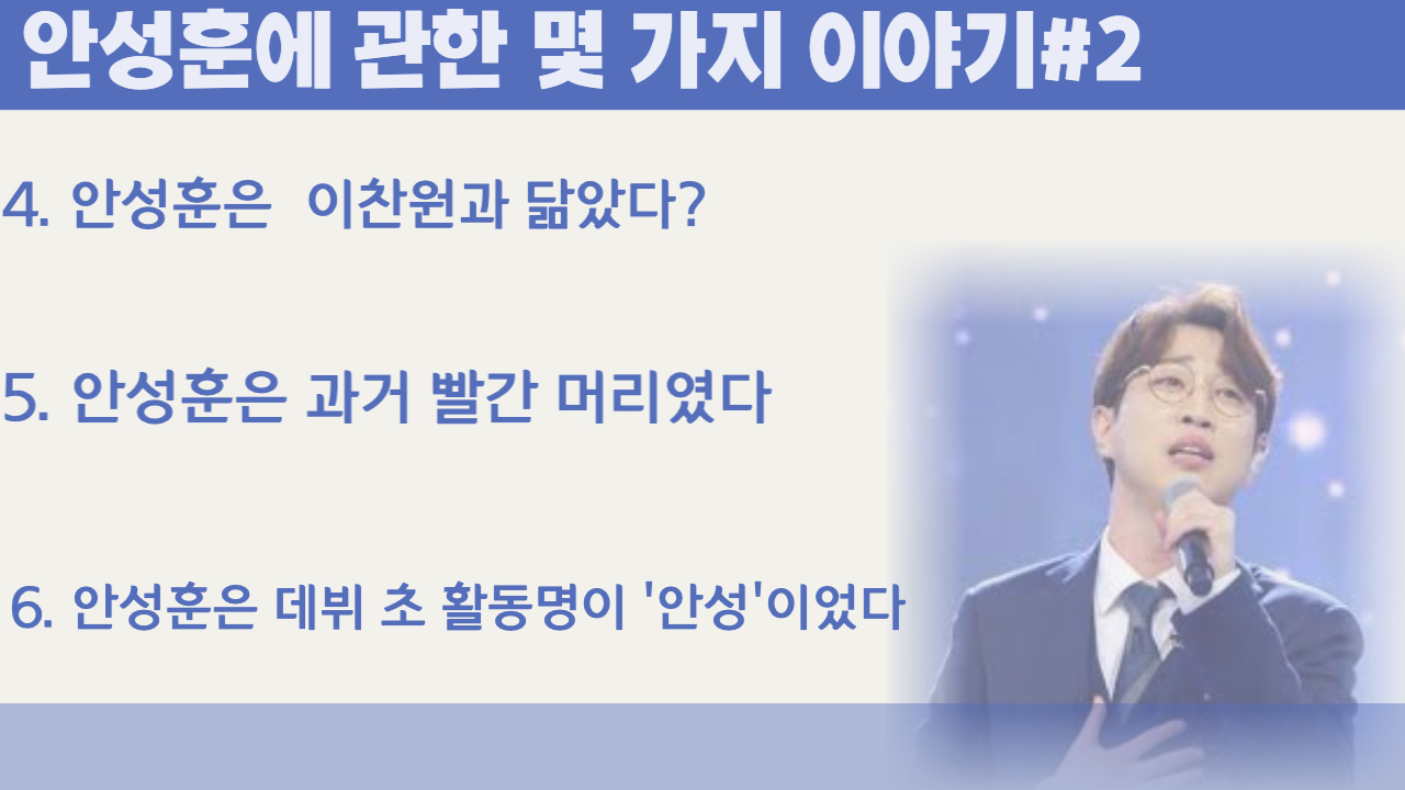마지막으로 안성훈에 관한 몇 가지 흥미로운 이야기를 알아 보겠습니다