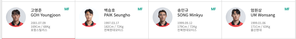 대표팀 명단을 포지션 별로 보면  공격진에는 박재용(전북), 안재준(부천) 정우영(슈투트가르트) 조영욱(김천상무) 선수들이 있습니다. 카타르 월드컵 국가대표이자 분데스리가에서 활약 중인 정우영 선수와 연령별 대표팀을 두루 거친 조영욱 선수가 눈에 띕니다.