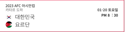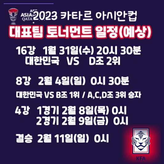 우리 대표팀이 예선 1위로 16강에 올라 차례로 다음 라운드에 진출할 경우 8강은 2월 4일(일), 4강은 8일(목) 혹은 9(금)에 치르게 됩니다. 그리고 대망의 결승은 2월 11일(일)에 펼쳐집니다. 결승이 펼쳐지는 날은 마침 설 연휴이기도 합니다. 대한민국 대표팀이 선전을 거듭, 설 명절에 온 가족이 모여 결승전을 보는 날이 오길 응원하고 기원해 봅니다.