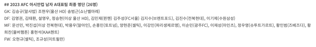 이번 아시안컵은 이전 대회와 달리 최종 명단을 26명까지 뽑을 수 있게 되었습니다. 변화 보다는 안정을 통해 우승을 노리는 클린스만 감독은 이번에도 대부분 기존 선수들을 뽑았습니다만 일부 어린 선수들도 선발, 국제대회를 통해 좀 더 성장할 기회를 얻도록 했습니다.