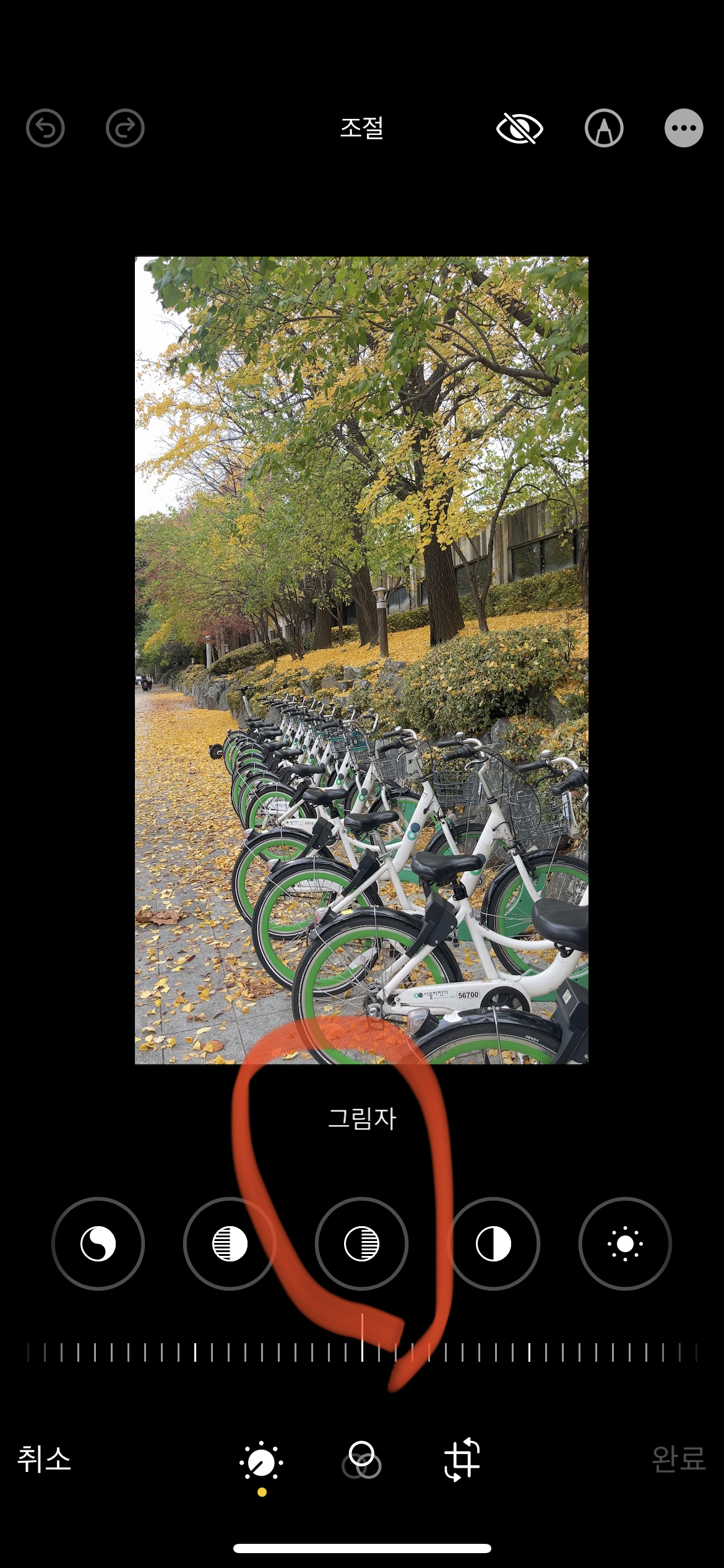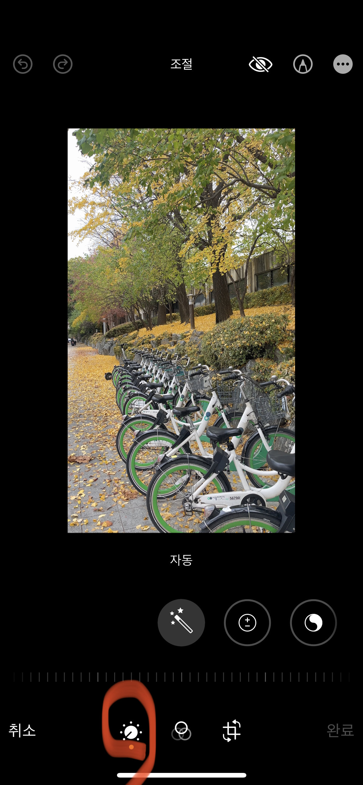 사진 선택 후 ▶ 편집(오른쪽 위) ▶ 사진 아래에서 조절 선택