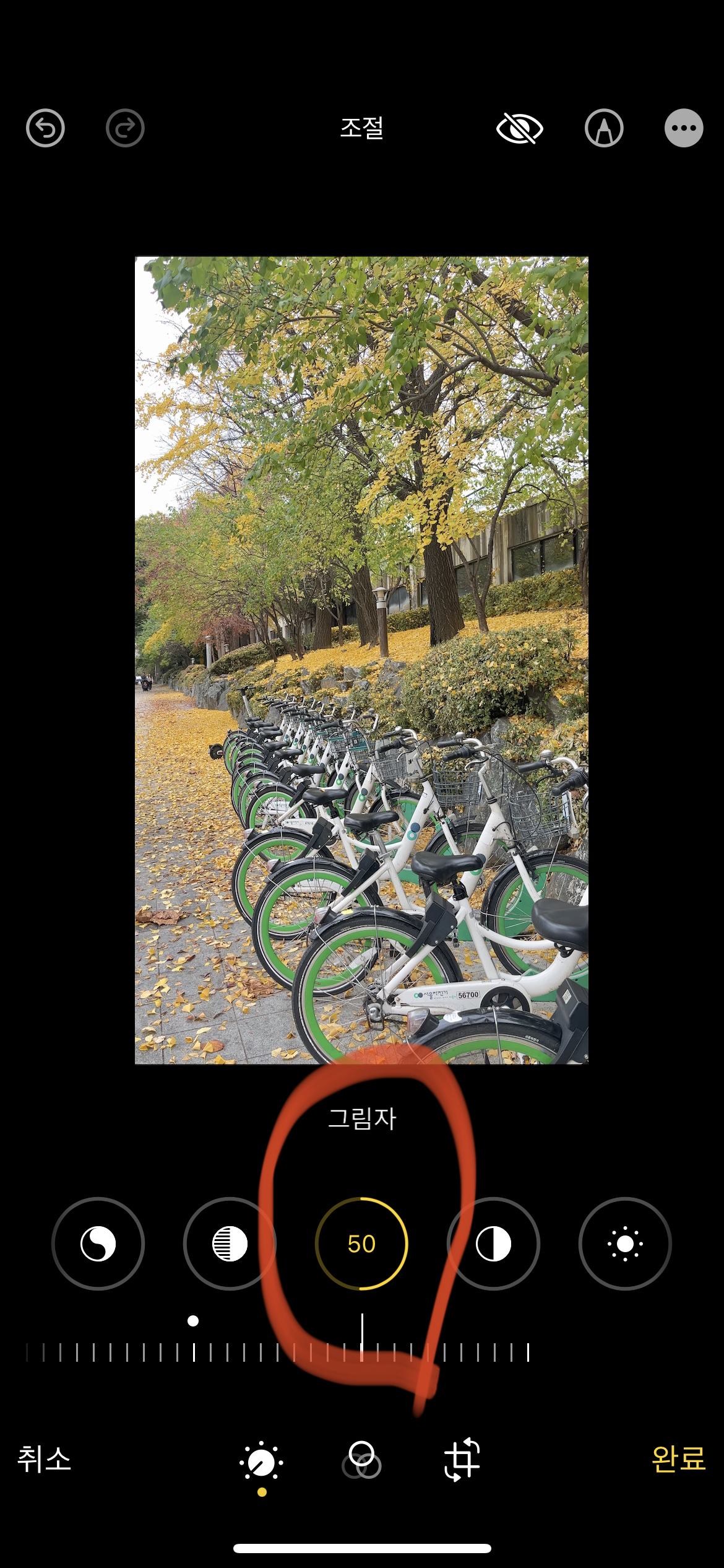 사진 선택 후 ▶ 편집(오른쪽 위) ▶ 사진 아래에서 조절 선택