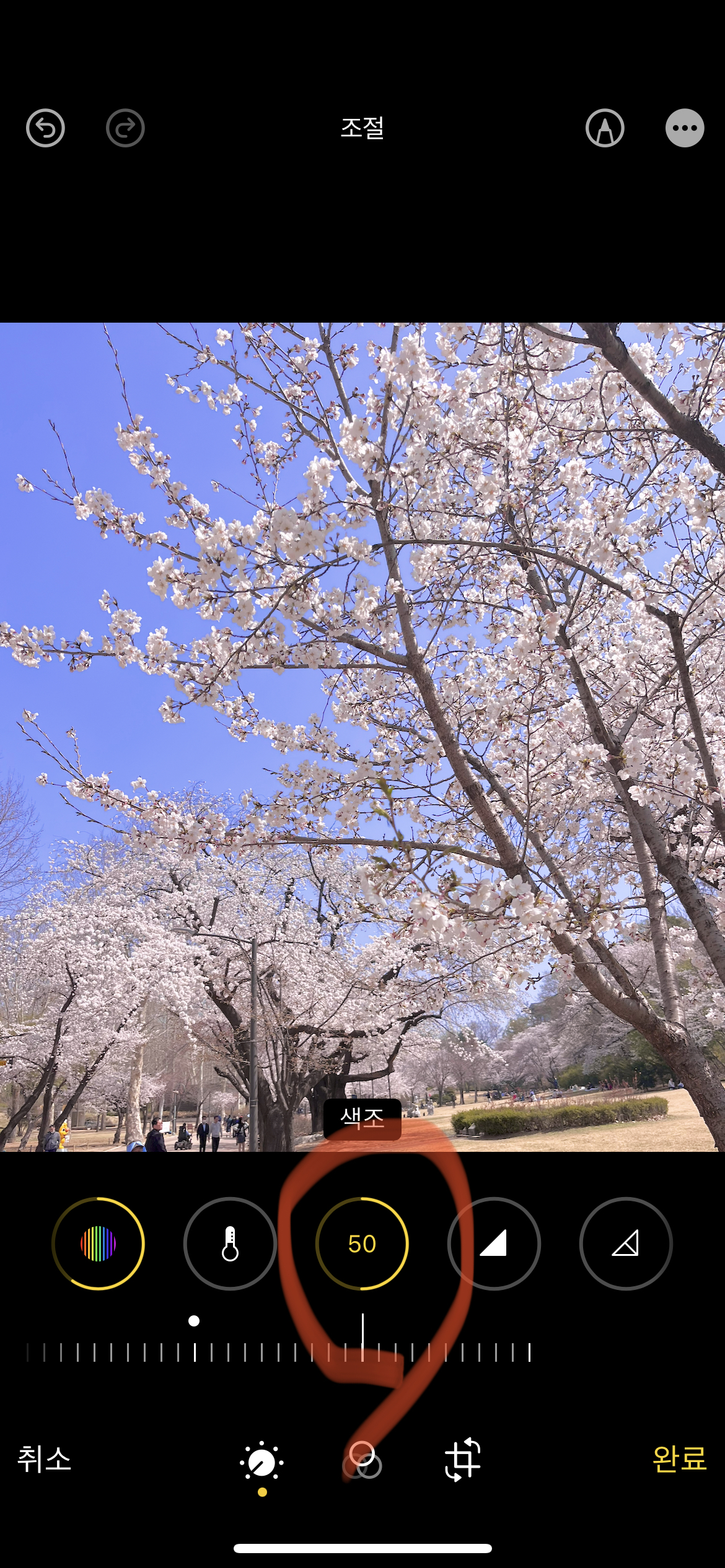 마지막으로 색조를 +50로 맞춰 주시면 보다 색감이 살아난 사진을 얻을 수 있을 겁니다.