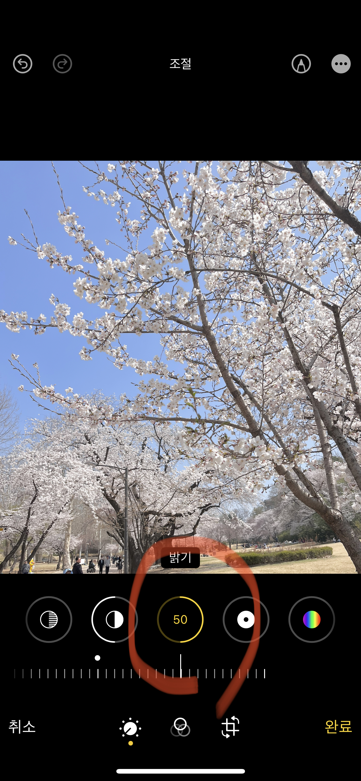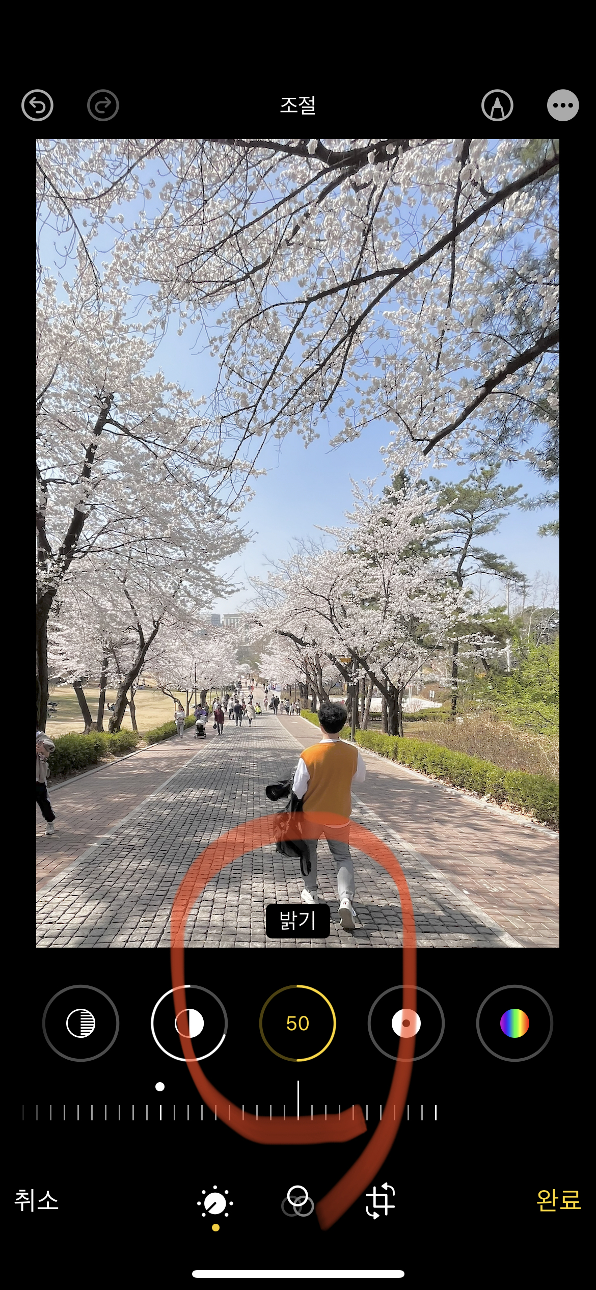 그리고 이어 밝기 +50입니다. 인물이 들어간 사진은 인물 피부톤을 고려해 밝기도 조절해 주어야 합니다.