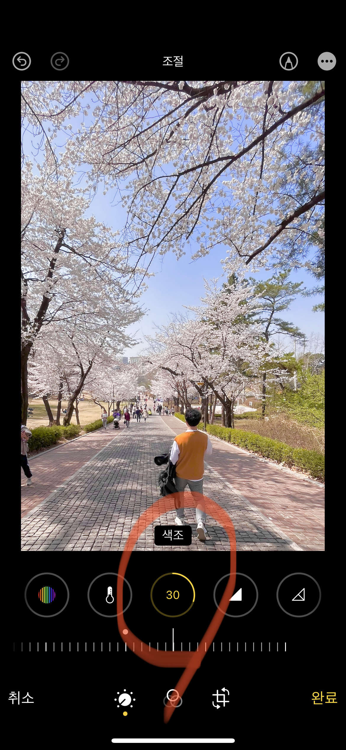 그리고 인물의 피부톤을 고려하여 색조를 조절하는데 저는 인물이 작게 나와 색조를 +30으로 맞췄습니다. 인물이 더 크게 나온 사진인 경우 인물의 피부톤을 보면서 색조 수치를 조절하시면 됩니다. (예를 들어 인물에 피부톤이 붉게 나왔다면 색조를 +10정도로 하시면 됩니다.)