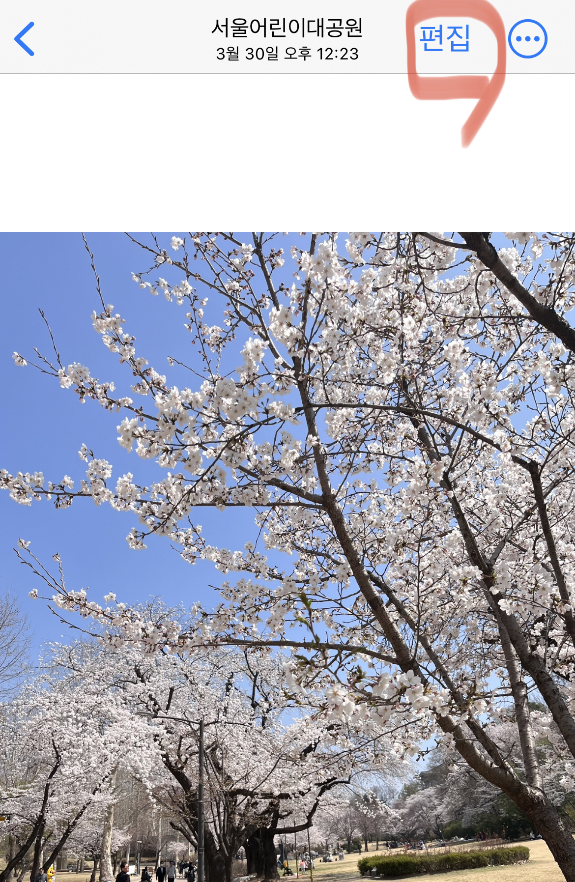 우선 벚꽃 사진 보정 간단 꿀팁입니다. 아래와 같은 벚꽃 사진 많이 있으실 겁니다. 그런데 왠지 모르게 심심하지요 그럼 아래 처럼 편집을 누르세요