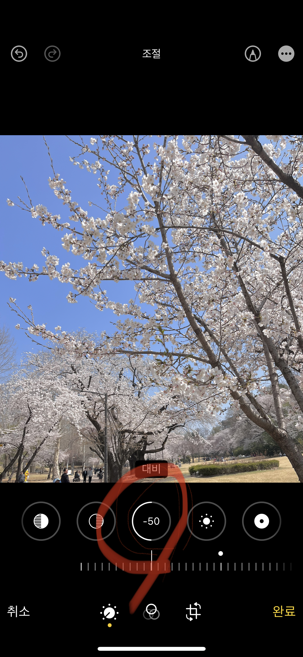그 다음으로는 인물이 벚꽃과 함께 있는 사진에 대한 간단한 보정 꿀팁니다. 역시 편집을 누르고 조절을 선택하신 후에
