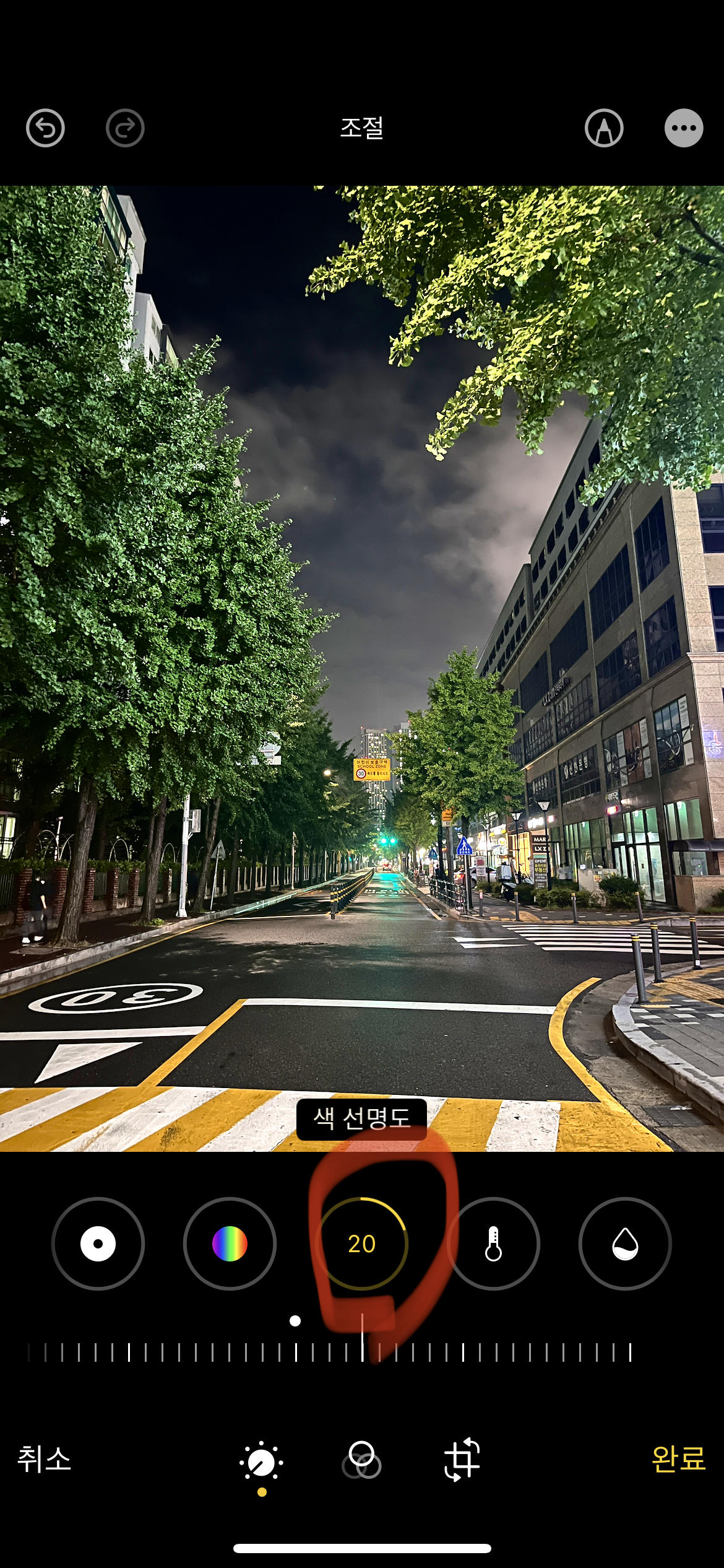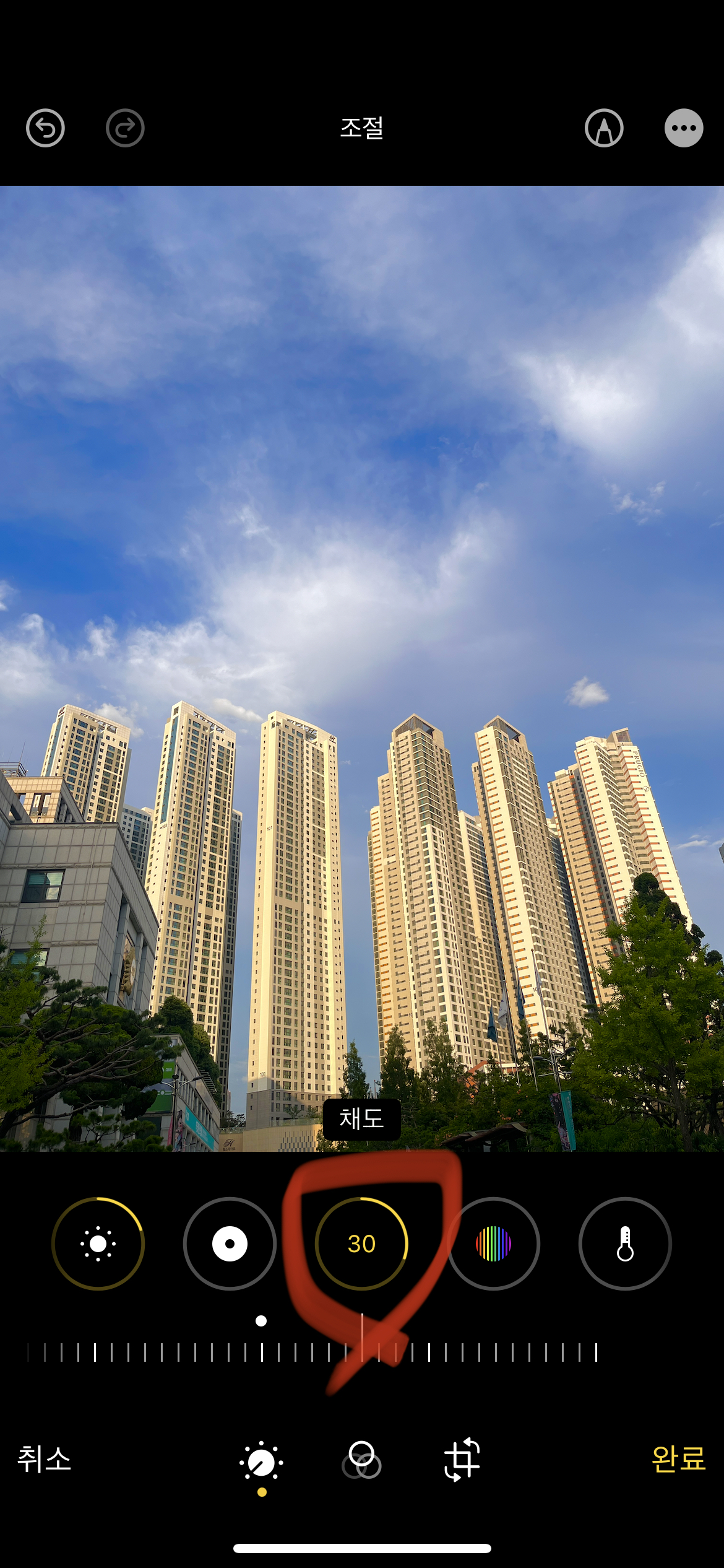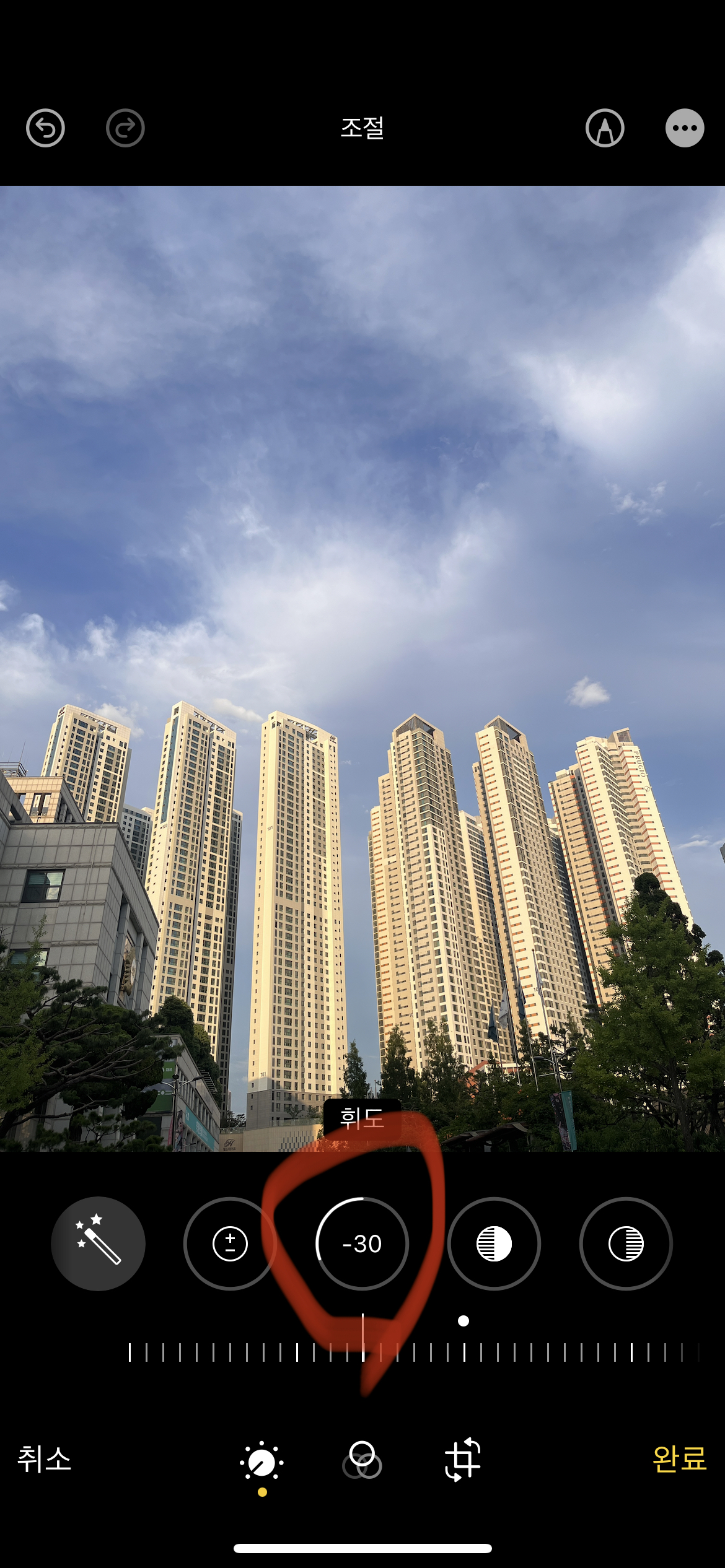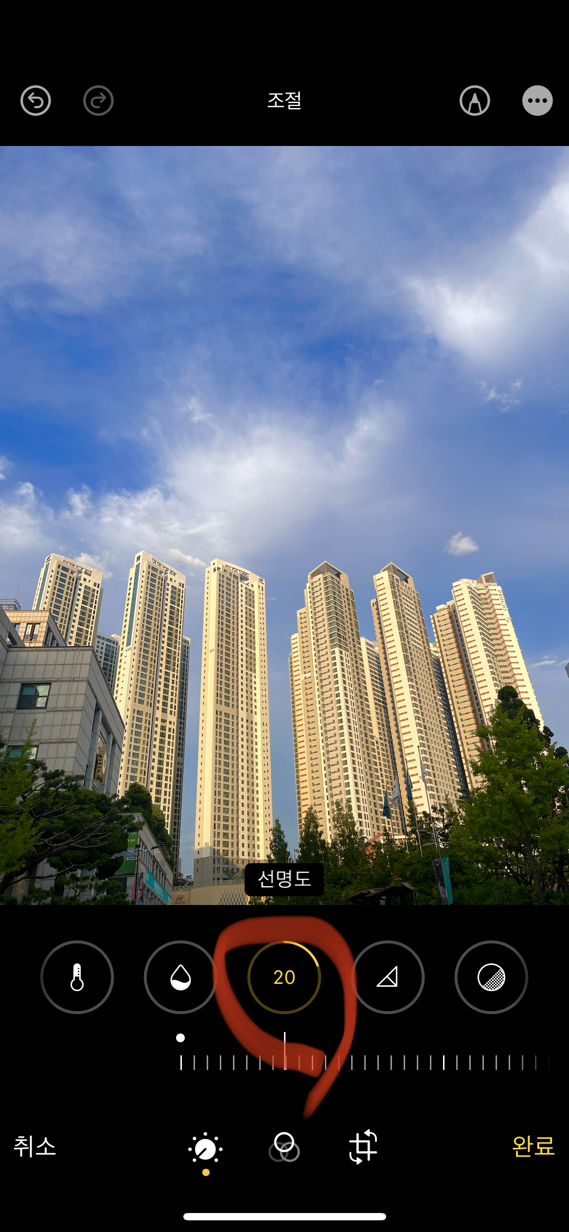 마지막으로 선명도를 조절하면 됩니다. 선명도는 사진 속 피사체들을 조금 더 날카롭고 선명하게 조정해줍니다 저는 사진 아파트 등 건물을 보다 뚜렷하게 하여 하늘도 건물도 살리려 선명도를 +20으로 조절했습니다.