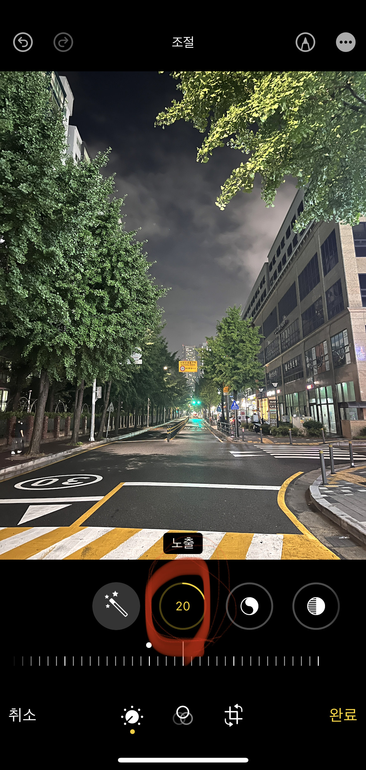아까와 마찬가지로 보정할 사진을 선택하고 편집 그리고 조절까지 눌러 줍니다. 우선 노출부터 보정합니다. 노출을 올리면 사진 전체적으로 밝아집니다. 그러나 노출은 피사체에 맞춰 있기 때문에 잘못하면 다른 부분이 너무 밝아져 날아가게 될 수도 있습니다. 저는 조금만 밝게 하려고 노출을 +20으로 조정했습니다.