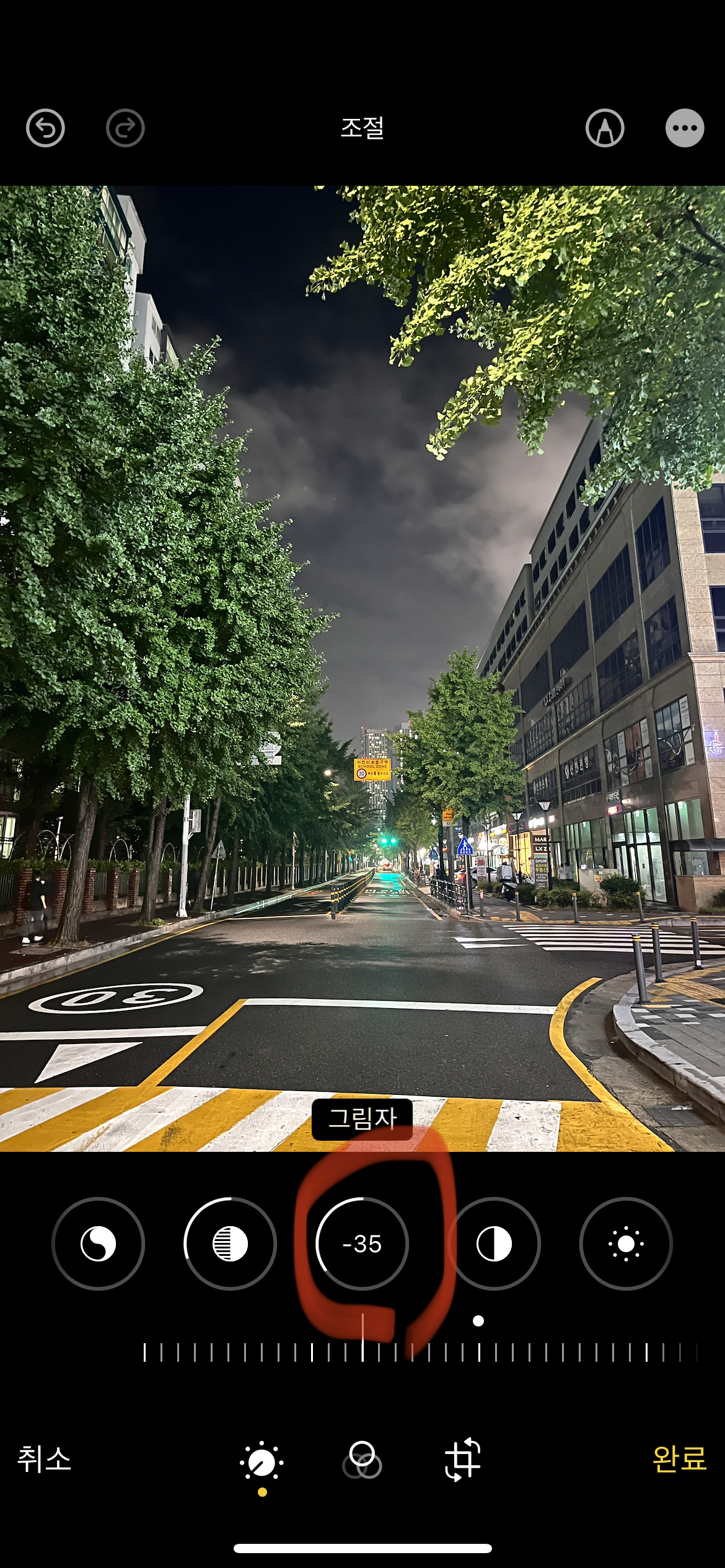 그 다음은 그림자입니다. 그림자는 하이라이트와 달리 가정 어두운 부분을 조절해줍니다. 그림자 -35로 조절 어두운 부분을 살짝 죽여줍니다.