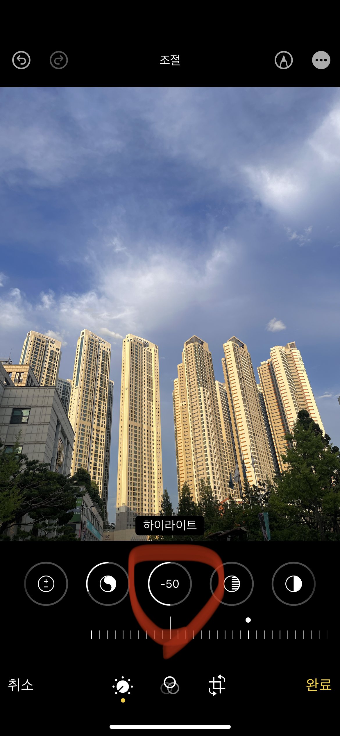 휘도를 조절했으면 그 다음은 하이라이트를 선택합니다. 하이라이트는 사진 속에서 빛이 가장 센 부분을 날려주거나(+) 살려줄 수 있습니다(-) 하늘 사진에서 하이라이트를 음수로 조정하면 구름을 살려줄 수 있습니다. 저는 하이라이트를 -50으로 맞췄습니다.