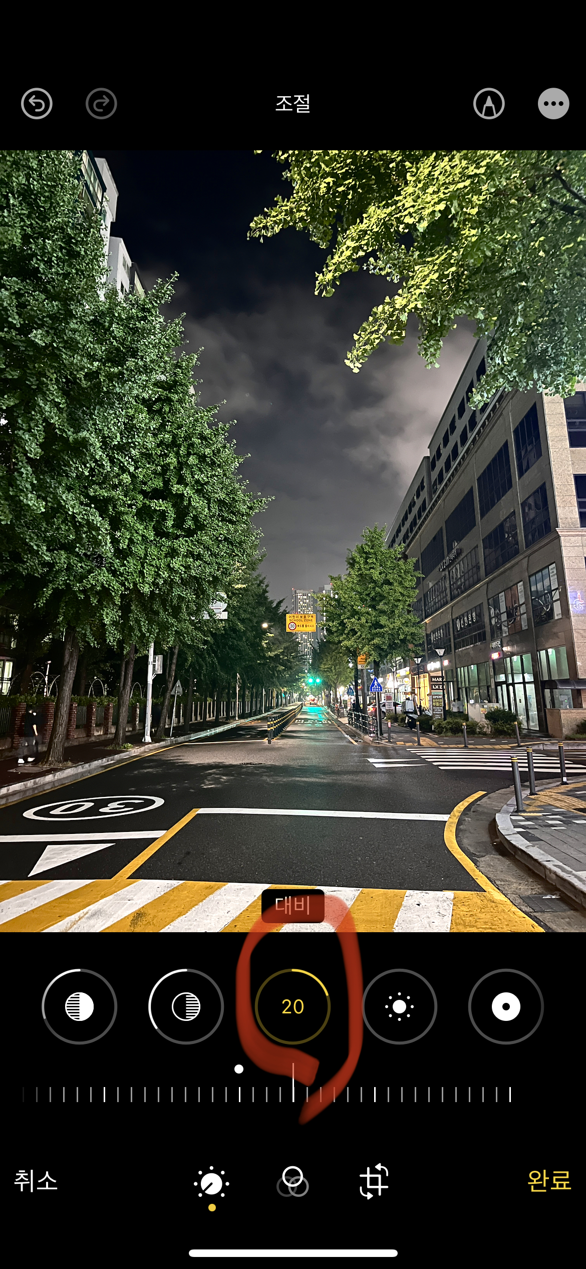 이제 대비를 조절할 차례입니다. 대비는 밝은 부분과 어두운 부분의 경계를 조절하는 것인데 대비를 올리면 두 경계가 진해지고 낮추면 흐려집니다. 저는 대비를 +20로 조절 밝음과 어둠의 경계를 조금 짙게 합니다.