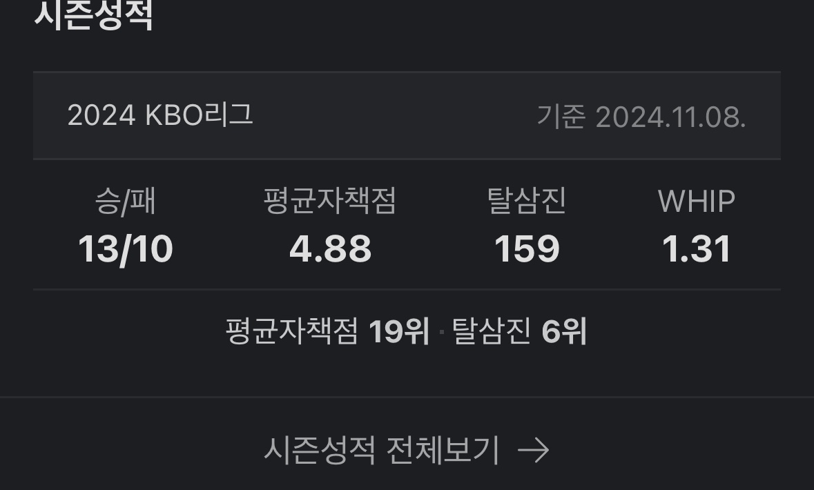 1,2선발급의 특별한 활약을 한 것은 아니지만 한 시즌 선발투수로서 로테이션의 한축을 맡아 4선발 정도의 제몫을 해주었다고 할 수 있습니다.