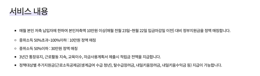 신청인이 선정되어 매월 10만원 이상의 적금 상품에 납입하면 정부에서 10만원을 지원금으로 적립해줍니다. 신청인이 기준 중위 소득 50%이하라면 같은 조건에서 정부에서는 30만원을 적립해줍니다.