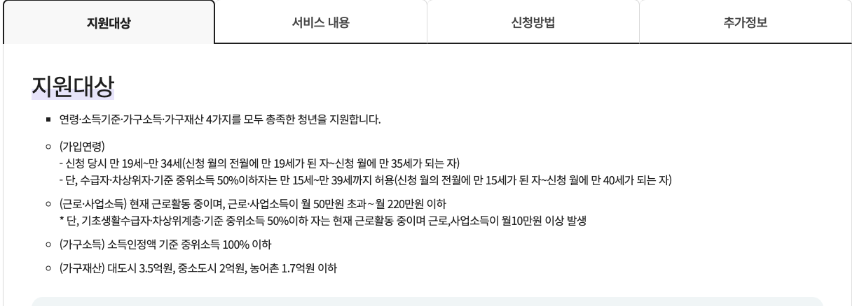 | 기준 중위 소득 50% 이상 계층 | 만 19세 ~ 만 34세 | 2003 ~ 1989년 출생 |