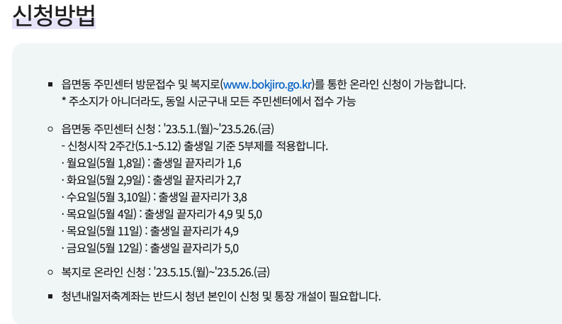 신청 기간 : 2023년 5월 1일(월) ~ 5월 26일(금)까지 본인 주소지 시군구내 주민센터에서 신청이 가능합니다.
