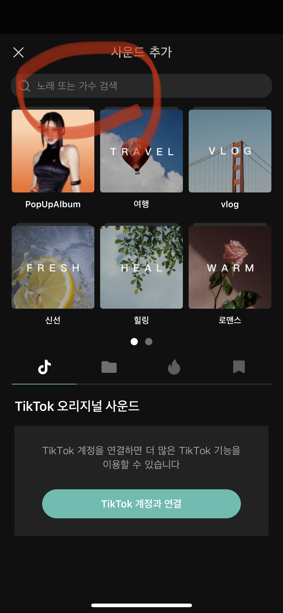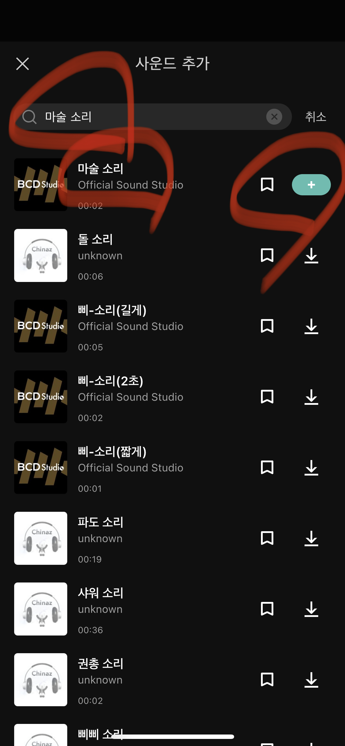 사운드 항목을 선택한 후 맨위의 노래 또는 가수 검색에서 원하는 효과음을 검색합니다.