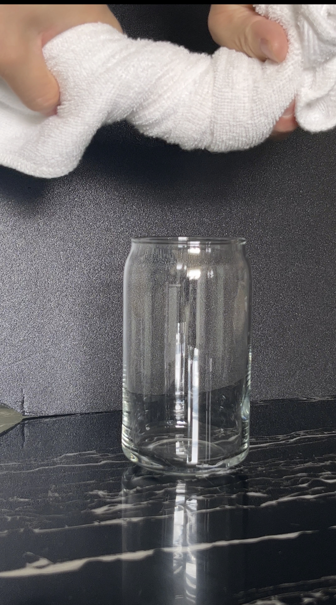 유리컵 위에서 수건을 짜는 동작을 촬영합니다.