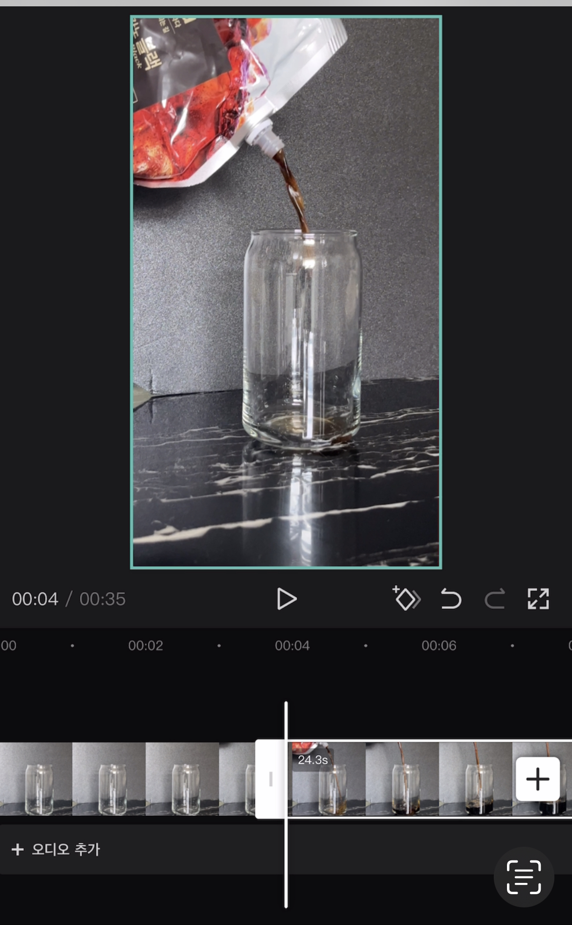 그리고 두 번째 커피 따르는 영상도 불러옵니다. 영상을 추가로 불러 올 때는 영상 오른쪽에 보이는 '+'를 클릭하시면 추가로 영상을 불러 올 수 있습니다. 그 다음 첫 번째 영상과 같은 방식으로 커피가 나오는 적절한 위치를 찾아 분할한 후 사용하지 않을 앞 부분 영상을 삭제해줍니다.