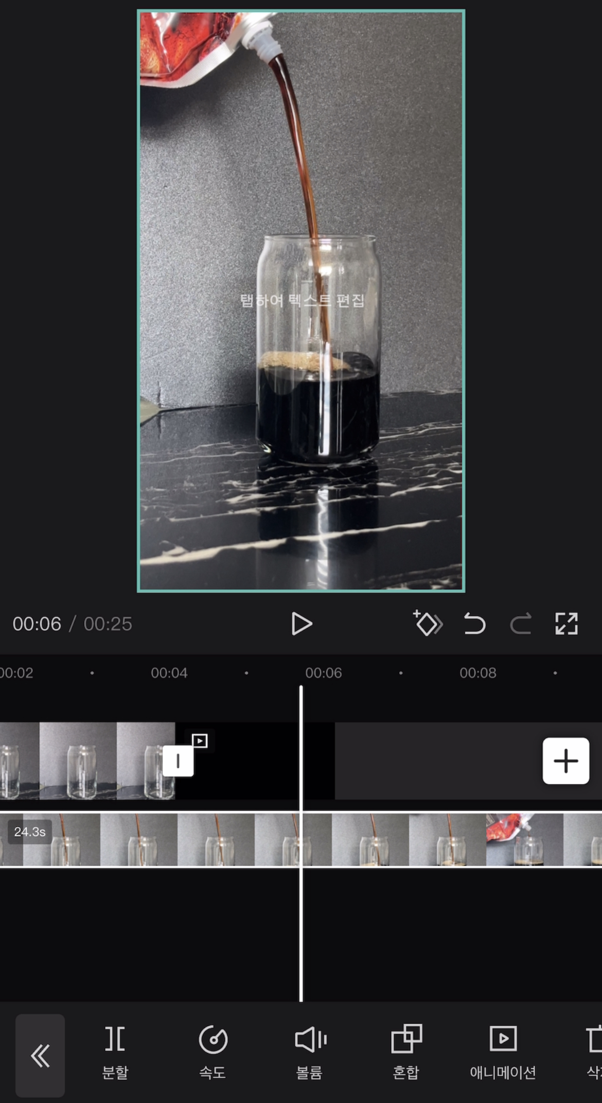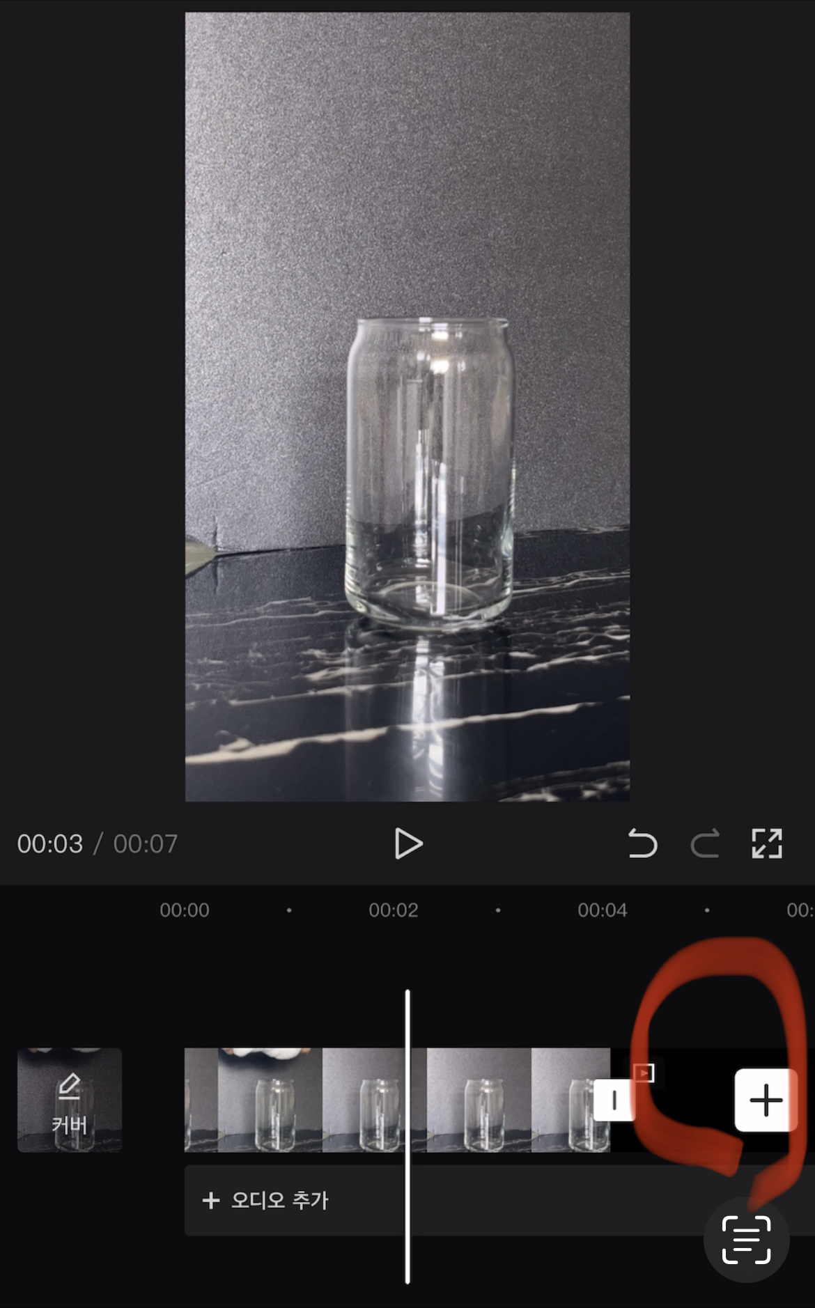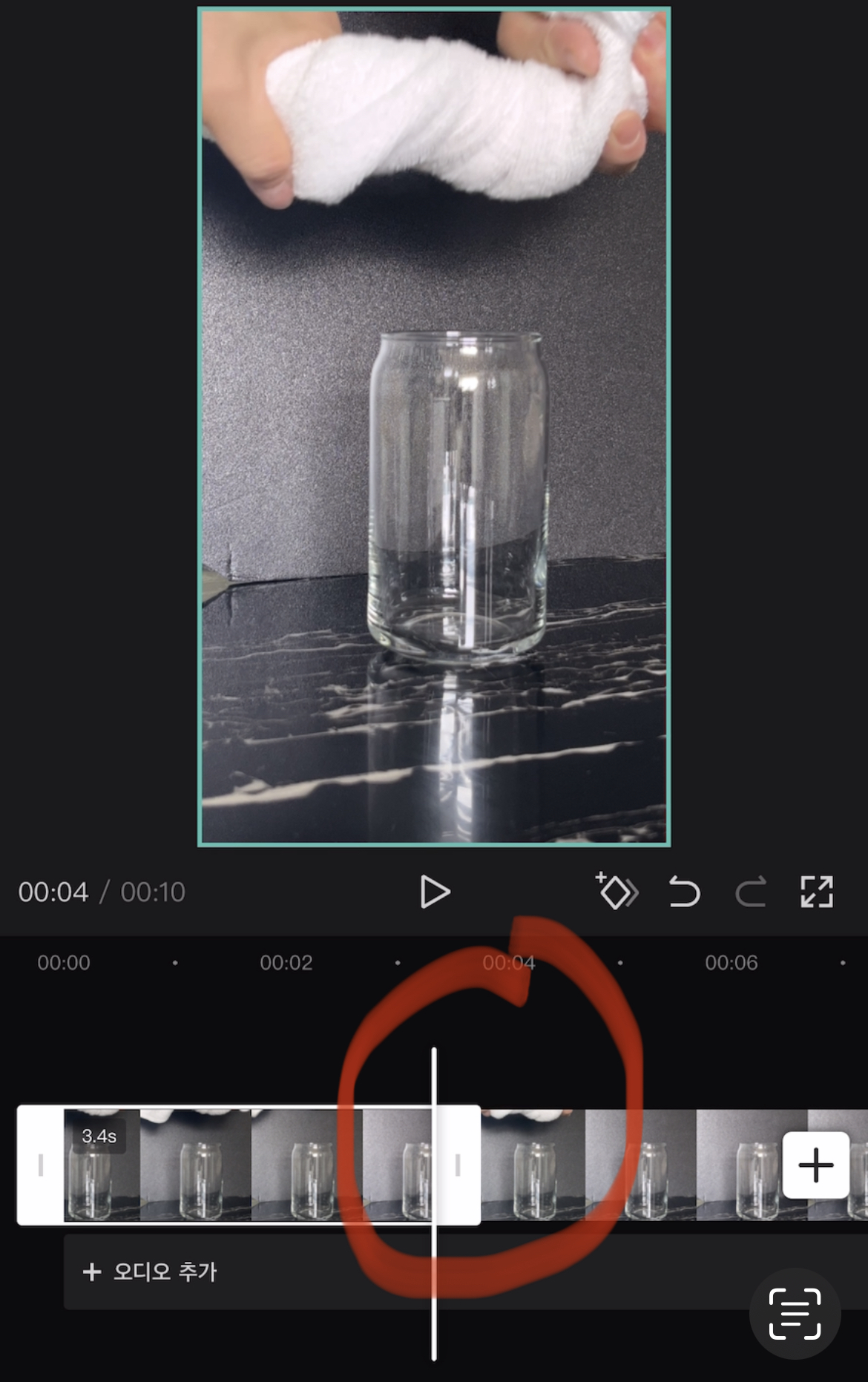캡컷으로 두 개 중 하나의 영상을 먼저 불러 옵니다. 저는 수건 영상을 먼저 불러 왔습니다.