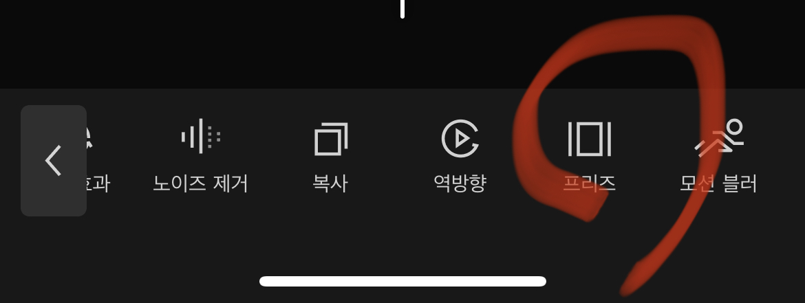 영상에서 원하는 부분을 선택한 후, 아래 기능 중 '프리즈' 를 누르면 영상의 한 부분이 이미지로 저장됩니다. 이미지로 저장된 영상을 길이 조절을 노출되는 시간을 조정할 수 있습니다.