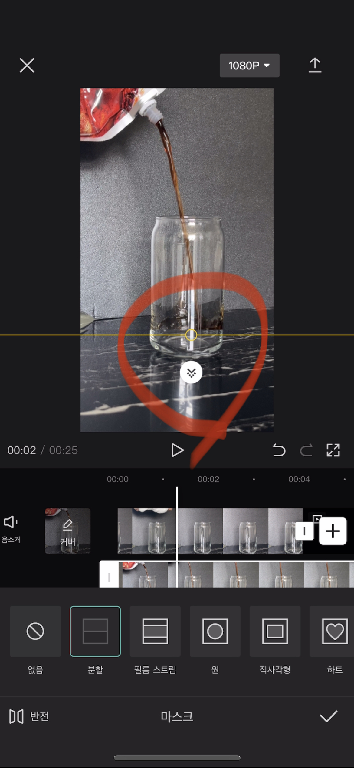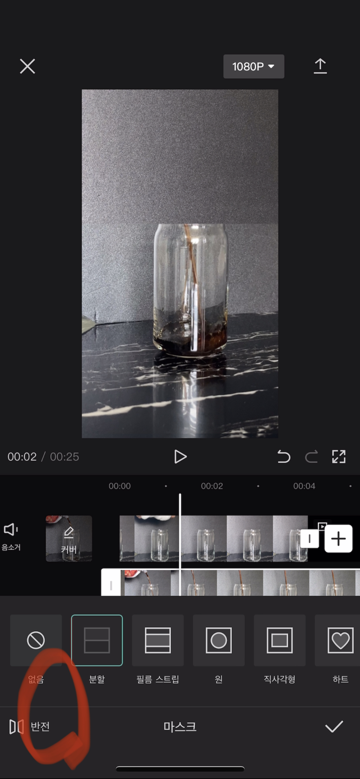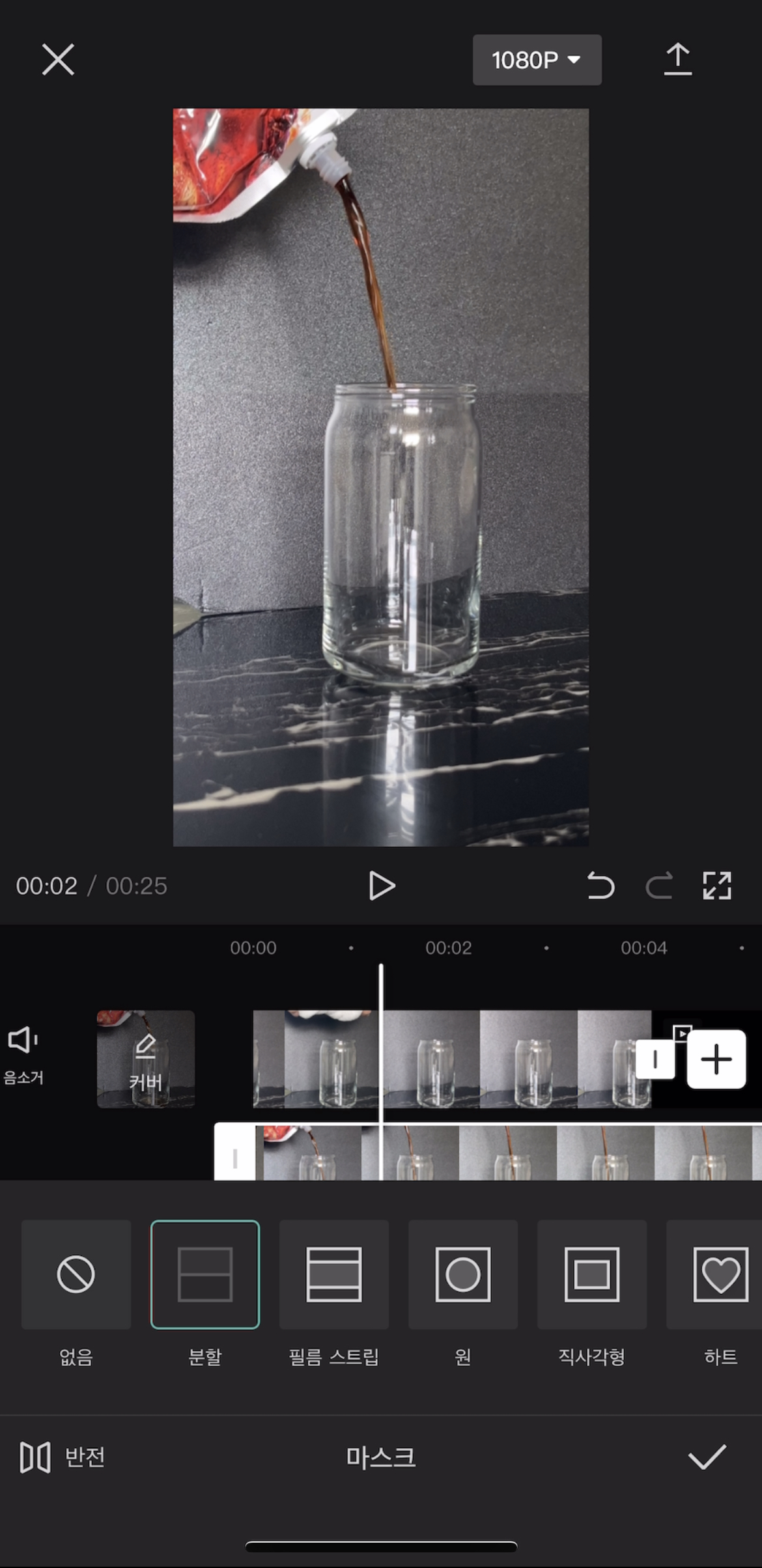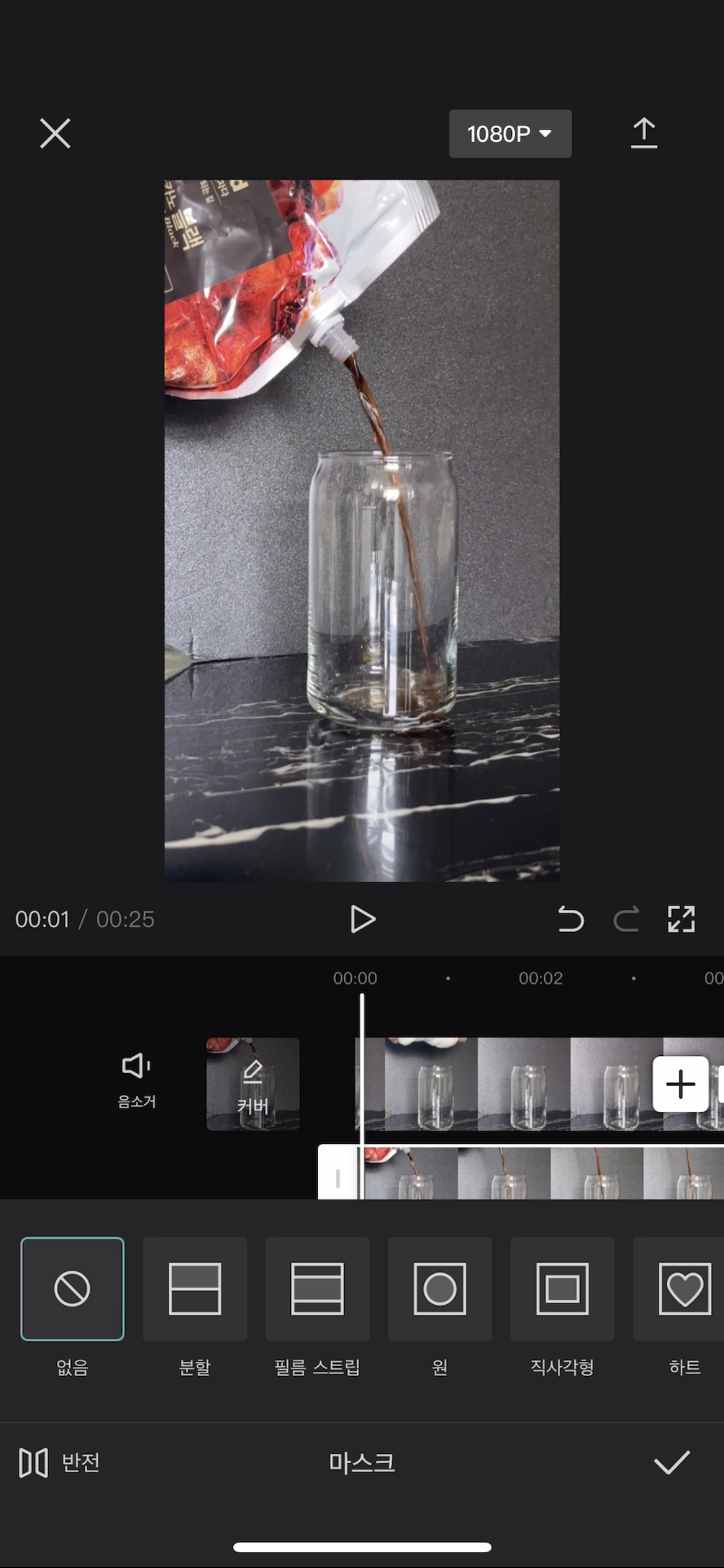 바로 커피 영상에 적용된 '마스크'를 누르고 '반전'을 선택해 주면 위 사진처럼, 아래쪽에 커피가 보입니다.