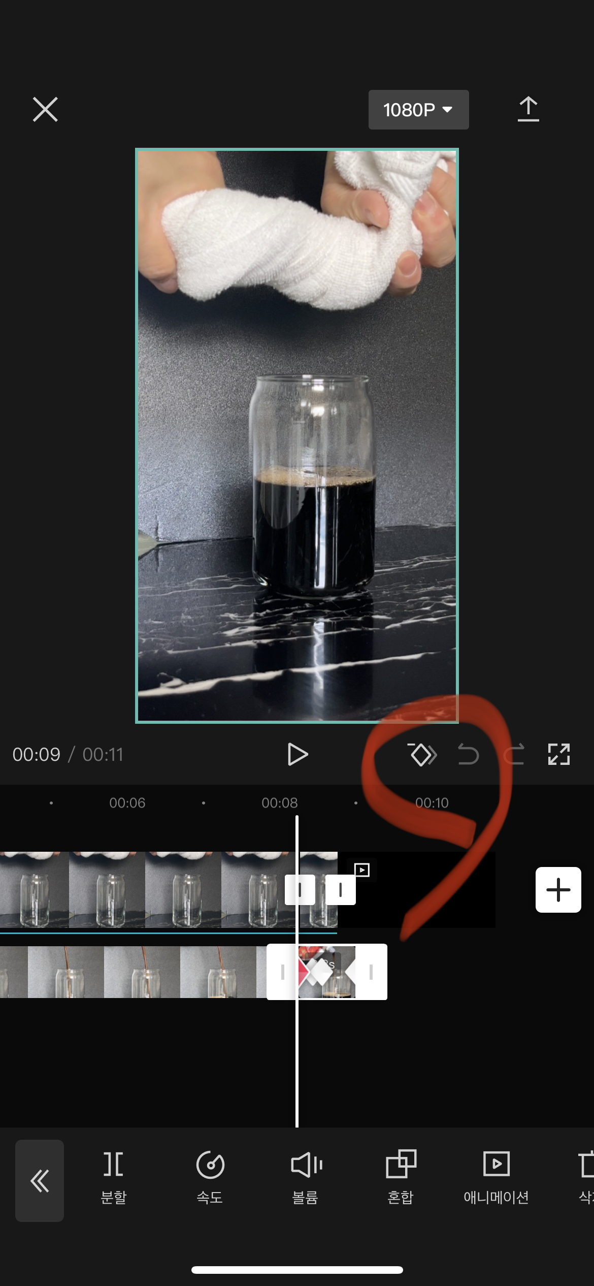 그런 다음 영상을 선택하신 후 '수건 짜는 동작'이 적절한 위치를 찾고, 그 위치에서 멈추는 화면 하단에 있는 '분할'을 클릭해줍니다. 그러면 위 빨간 동그라미처럼 하나의 영상이 둘로 나뉩니다. 그러면 앞 부분의 영상을 클릭한 후 삭제해주고 뒤에 부분만 남깁니다.