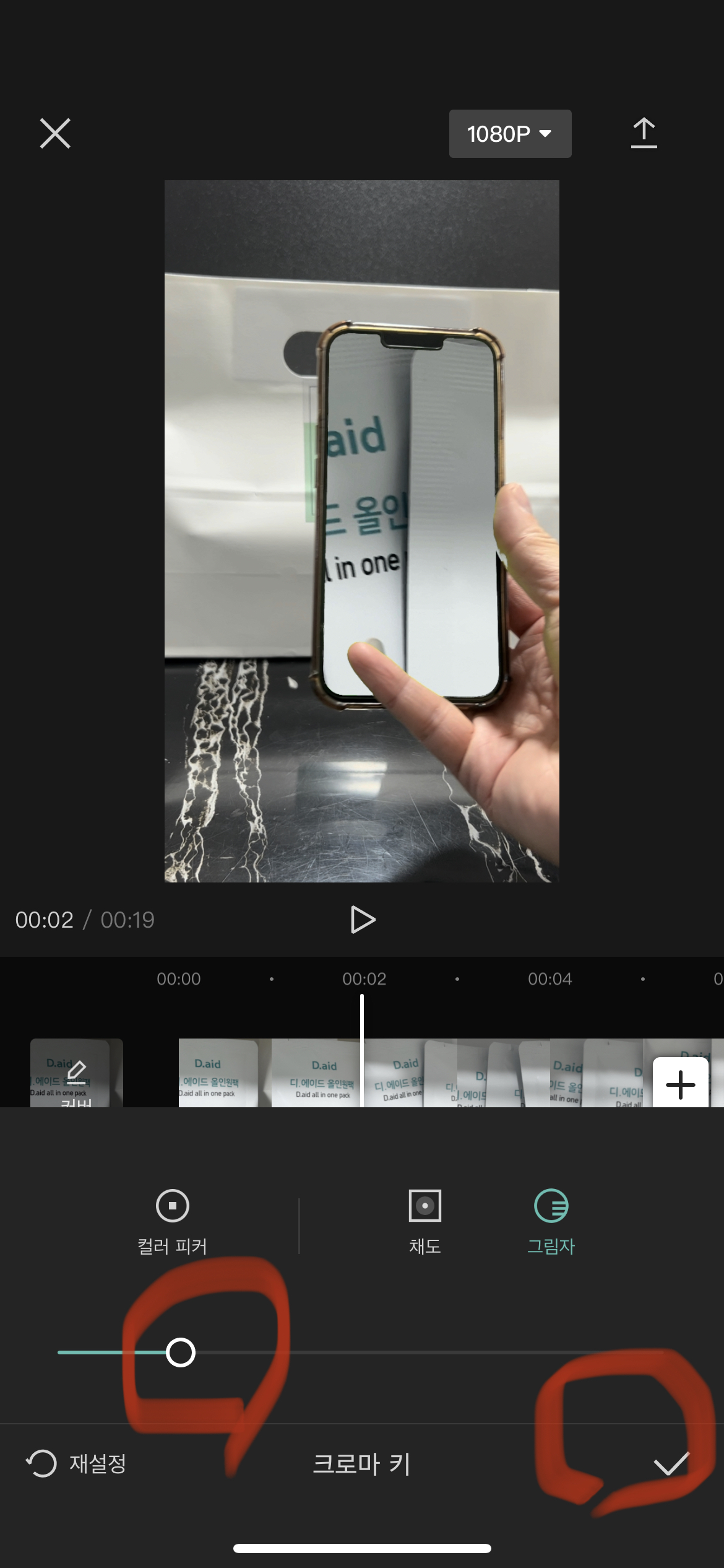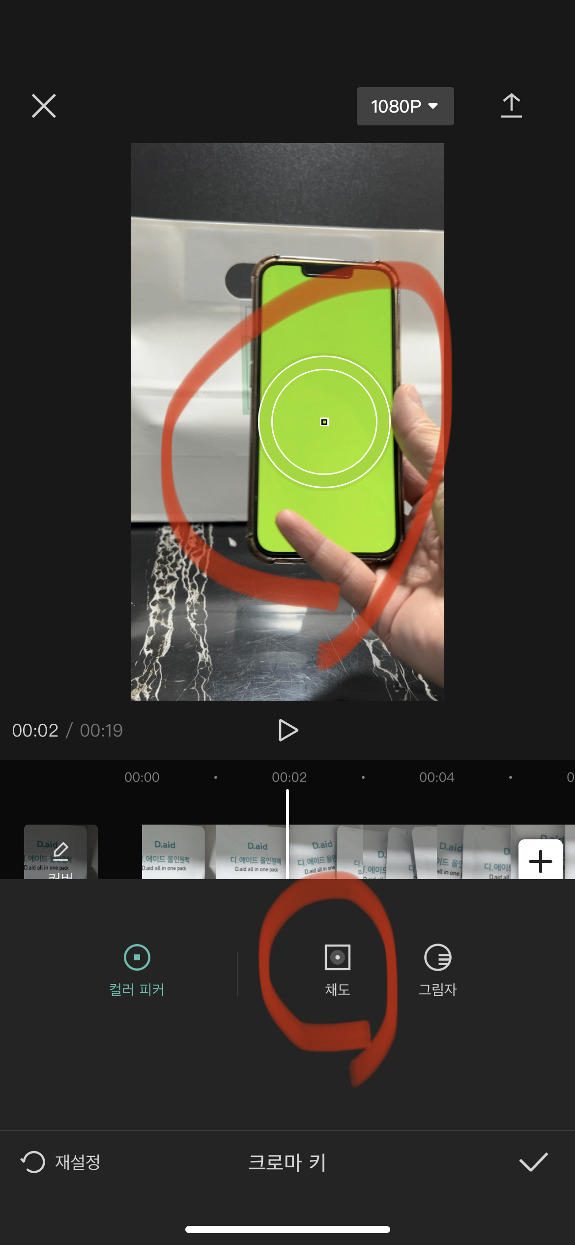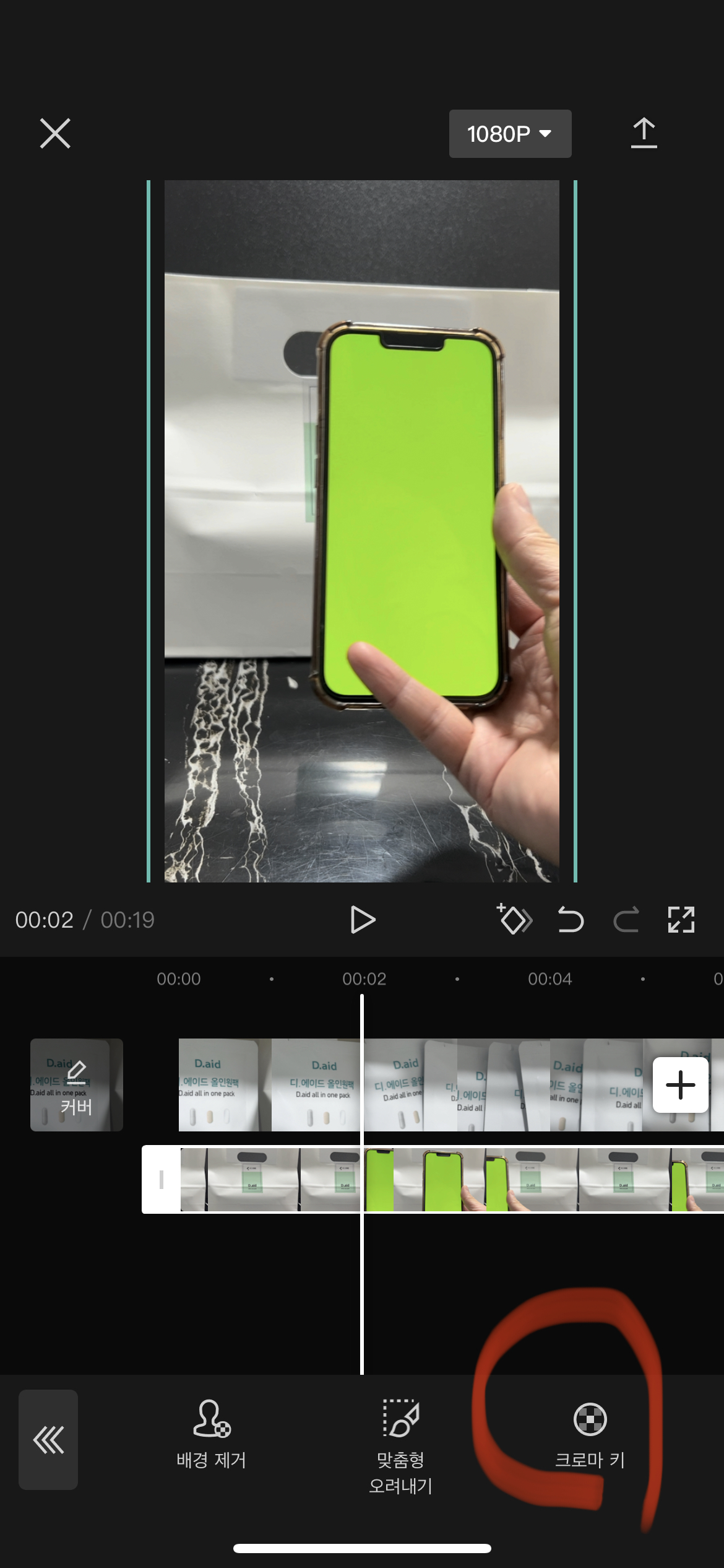 이때 촬영하는 휴대폰 화면에 그린스크린이 나오도록 촬영해야 합니다.