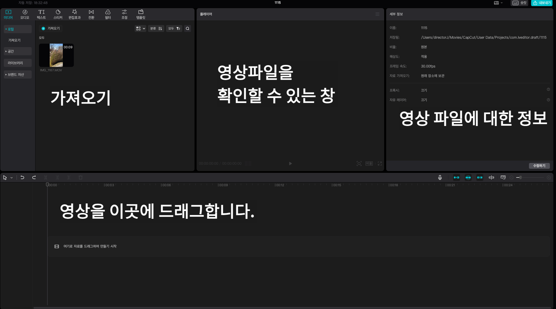 캡컷 PC버전 다운로드하고 설치까지 마무리하셨다면 간단하게 기본 기능 익혀보도록 하겠습니다.