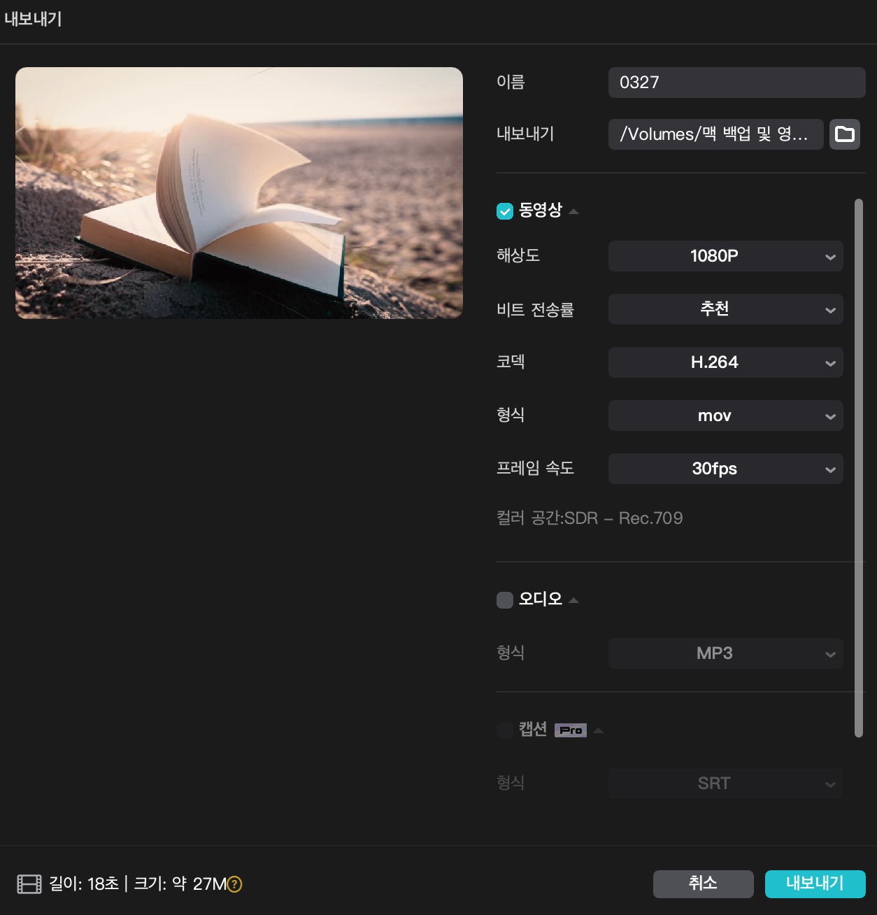 이렇게 편집을 마무리했다면 이제는 작업한 영상을 동영상 파일로 내보내기하셔야 합니다. 오른쪽 맨 위에있는 '내보내기'를 누르면 팝업 창이 뜹니다. 그러면 거기서 영상 파일 제목, 저장 경로 등을 설정하신 후 오른쪽 아래 내보내기를 클릭하시면 동영상 파일이 생성됩니다.