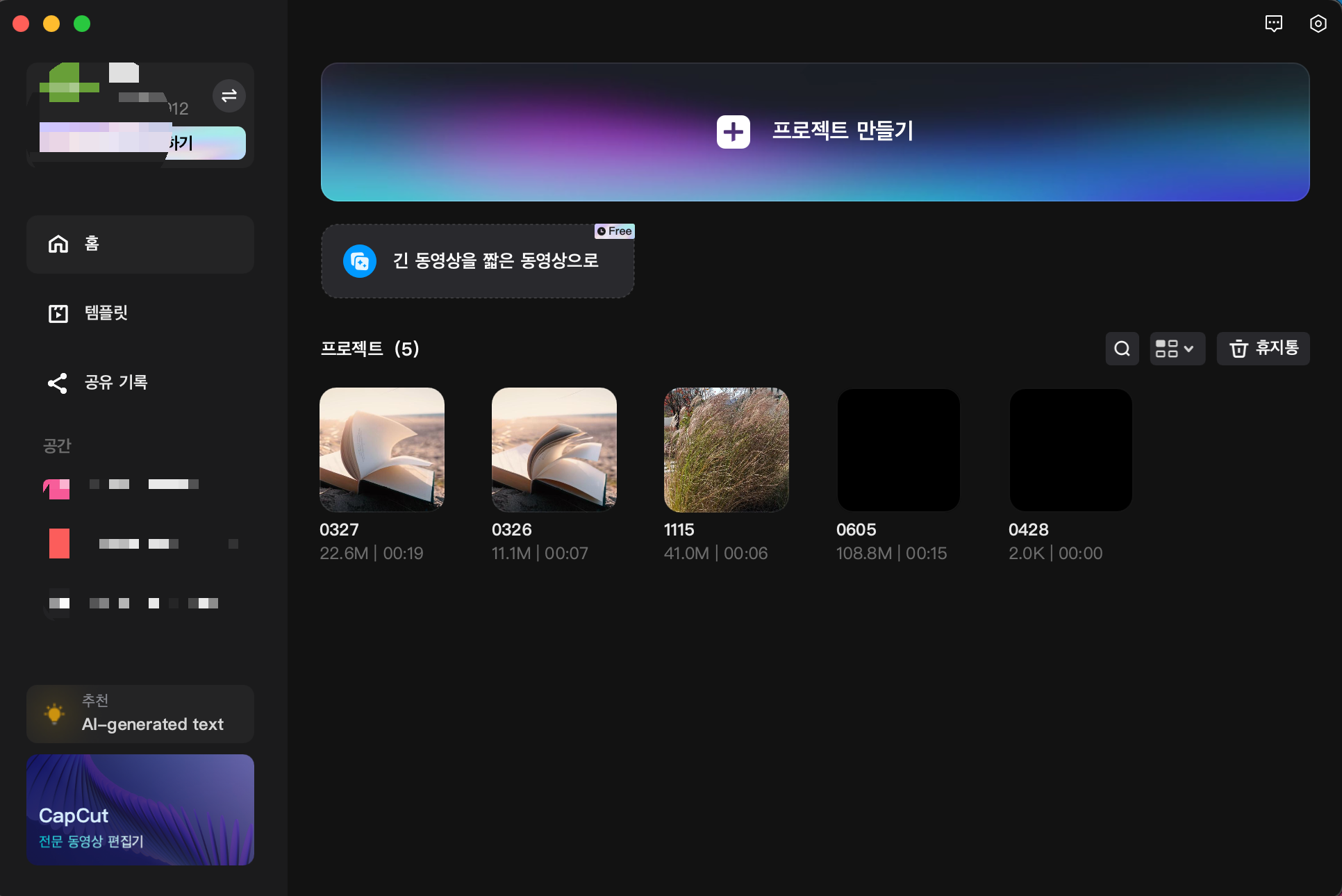 캡컷 PC버전을 설치한 후 캡컷 아이콘을 클릭하면 프로그램이 실행됩니다. 그럼 아래와 같은 창이 뜨는데요 여기서 프로젝트 만들기를 클릭하시면 새로운 작업창이 뜨게 됩니다.