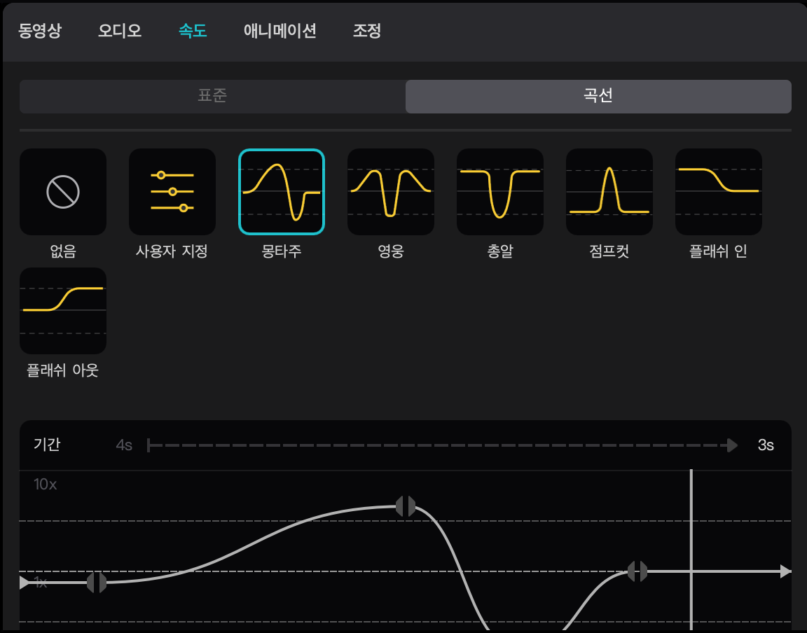 그런데 단순히 속도를 빠르게 혹은 느리게만 해서는 뭔가 아쉬울 수 있습니다. 이때는 동영상 느린 정도와 빠른 정도를 적절하게 조절하면 훨씬 좋은 영상이 될 수 있는데요 속도 항목에서 곡선 항목을 활용하시면 가능합니다. 몽타주 점프컷 등의 다양한 속도 효과를 선택만하면 영상에 간단하게 적용됩니다. 또 원한다면 위 작업 창의 아래 그래프를 앞뒤나 위아래로 조절하여 자신만의 느낌을 더 잘 살릴 수도 있습니다.