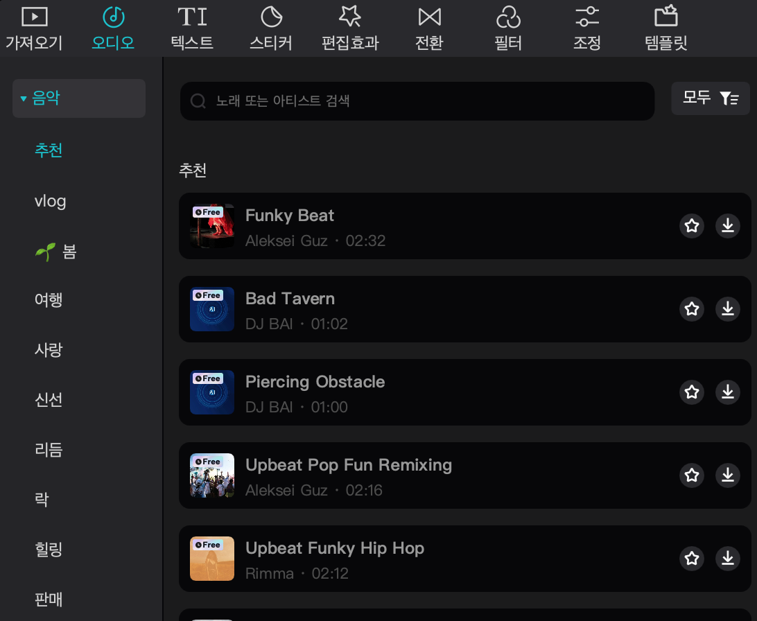 영상만 있고 BGM이 없으면 약간 심심할 수도 있습니다. 캡컷 PC버전에서는 아주 간편하게 영상에 어울리는 음악을 넣을 수 있습니다. 맨 왼쪽 메뉴에서 오디오를 선택하시고 그 아래 음악 메뉴를 펼치시면 다양한 장르 및 효과의 음악들을 확인하실 수 있습니다. 또 해당 음원을 클릭하면 미리 듣고 선택할 수 있고 원하는 음악은 음악 파일에서 +를 클릭하면 간단하게 타임라인에 추가할 수 있습니다.