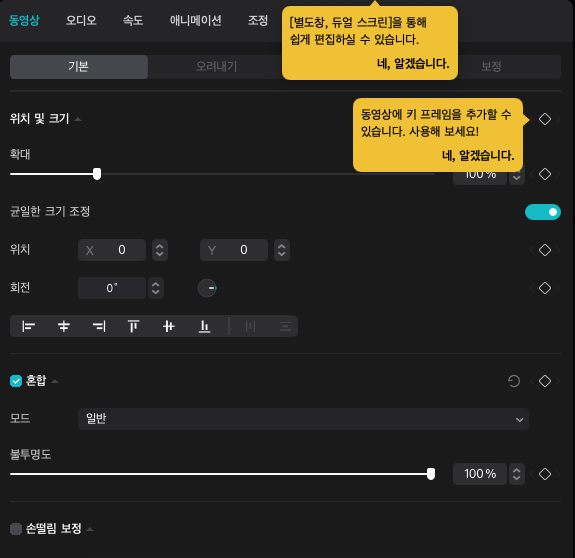타임라인 외에도 동영상에 여러 효과를 줄 수 있는 작업창이 있습니다. 바로 플레이어 옆에 보이는 창인데요 여기는 기본적으로 동영상 클립의 정보를 보여주면서 오디오 속도를 조절하거나 애니메이션 효과를 줄 수 있습니다.