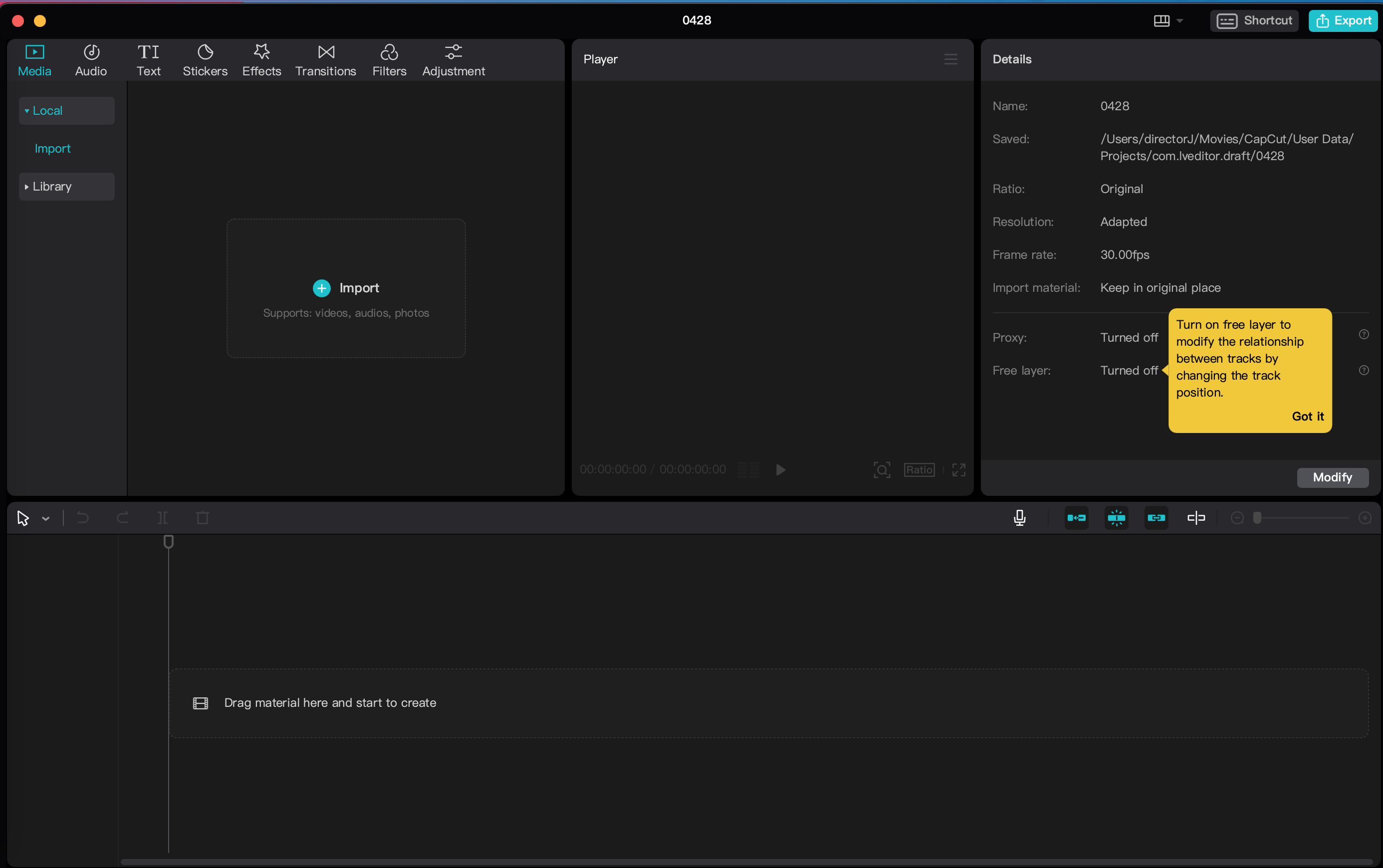 이런 창이 뜨면 필요한 영상이나 사진을 'import'를 클릭하여 불러 오신 후 맨 아래 'Drag ~'라는 글씨가 적혀 있는 작업 창으로 '드래그'하셔서 필요한 편집 작업을 하시면 됩니다.