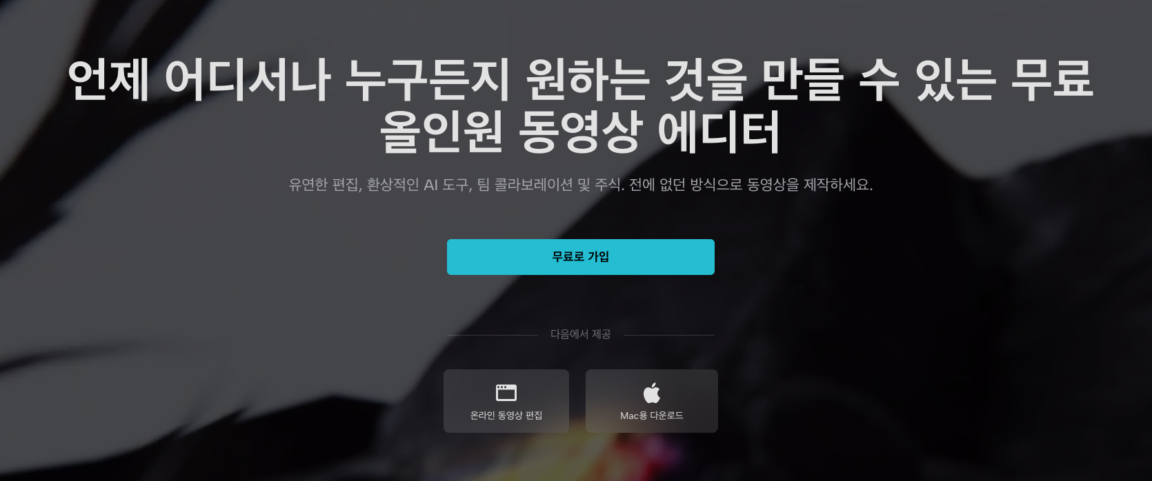 그러면 아래와 같은 홈페이지 화면이 뜹니다. 맨 아래 왼편에 온라인 동영상 편집을 누르면 별도의 다운로드 없이 온라인 상으로 필요한 영상을 편집할 수 있습니다. 오른편에는 MaC 용 다운로드라고 보입니다. (윈도우 PC의 경우 Window 용 다운로드라고 뜹니다.)