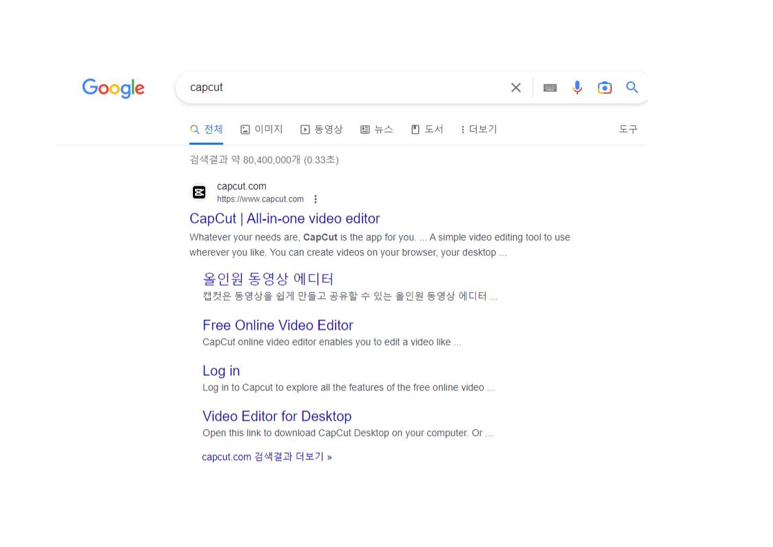 그러면 검색 결과 맨 위에 'CapCut All in one video editor'라는 문구가 보이실 겁니다. 그게 바로 캡컷 홈페이지입니다. 주저 말고 클릭하시면 됩니다.