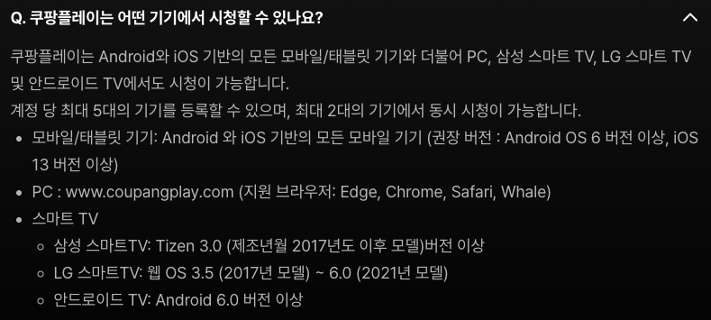 쿠팡플레이는 하나의 아이디로 최대 다섯 대의 기기를 등록하여 즐길 수 있습니다. 스마트폰, 태블릿, PC를 비롯하여 인터넷이 사용 가능한 TV에서도 어플을 설치하여 즐길 수 있습니다. 여기에 하나의 아이디로 동시 접속은 두 명까지(두 대)까지 가능하다고 합니다.